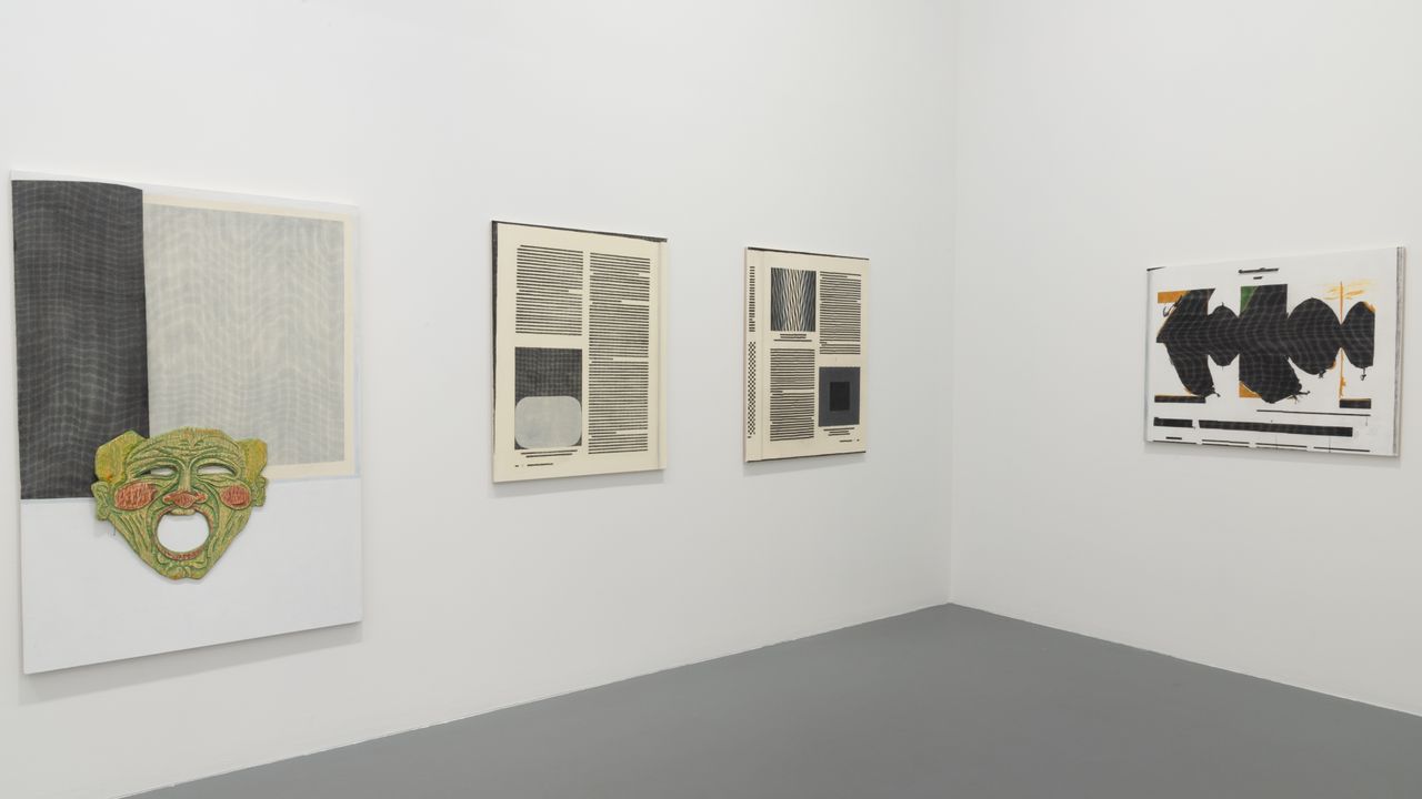 Replicated by means of overlaid, slightly out of register grids, text and illustrations dissolve into shimmering, more or less dense coloured areas. In the course of its transfers from one medium to another – from printed page to photocopy to canvas – the message seems to have evaporated on contact with the canvas, giving way to free-floating images. These pictorial processes show Collins returning to the printing profession he learned hands-on at the same period, working in independent publishing houses.