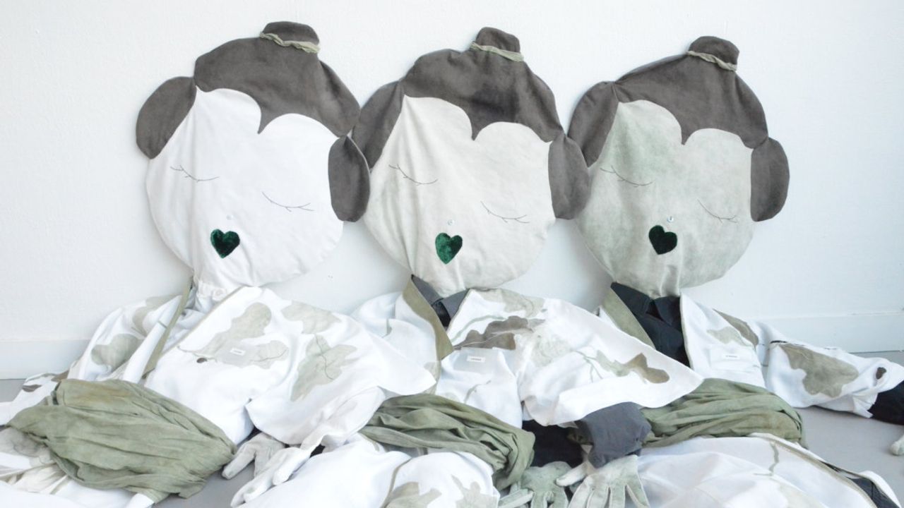 Rights reserved: Thomas Gaugain, Trois Parques ((Geisha version)), 2022, dimensions variables, teinture végétale sur coton, broderie en application, soie, papier, vêtements de 2nd main, badge, vue de l'exposition hors les murs Rennes Babylone, Hôtel Pasteur, Rennes, du 17 au 18 décembre 2022, production : La Criée centre d'art contemporain