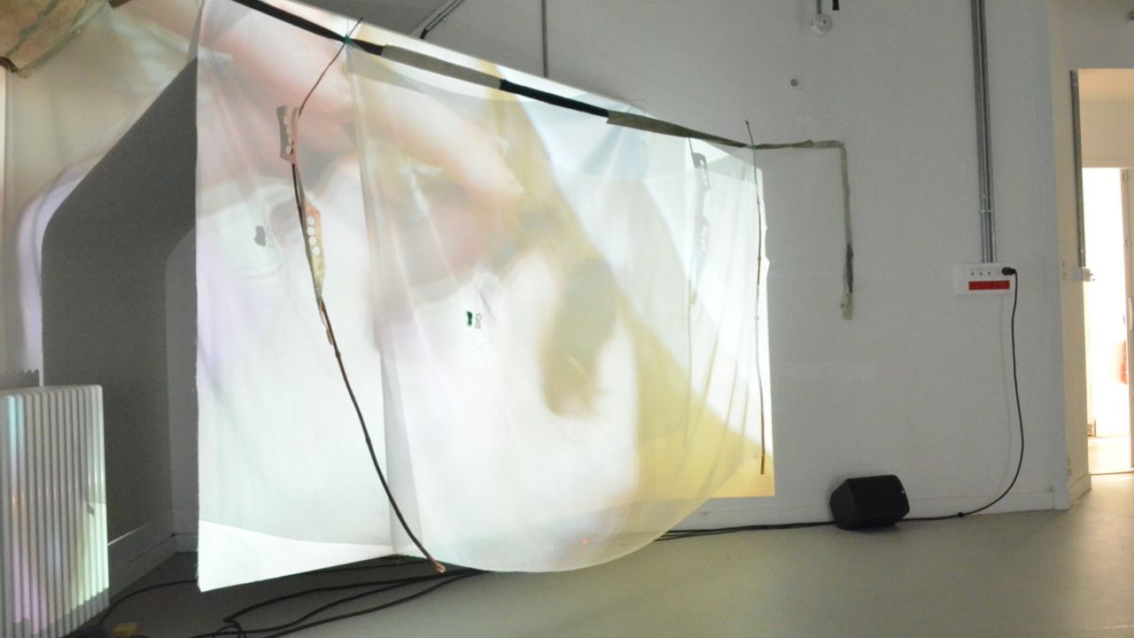 montage : Clovis Lvh, installation vidéo, dimensions variables, organza brodé et teint, bois, vue de l'exposition hors les murs Rennes Babylone, Hôtel Pasteur, Rennes, du 17 au 18 décembre 2022, production : La Criée centre d'art contemporain