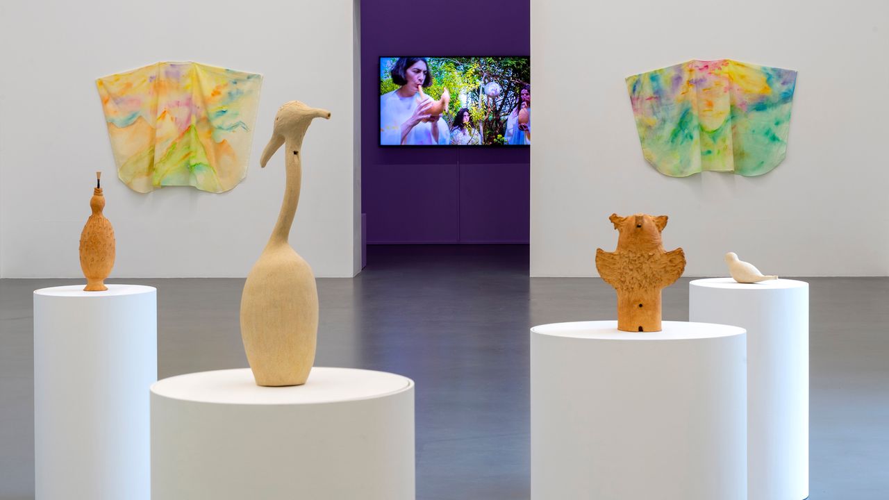 Kameli’s translation of the The Canticle of the Birds is sensual and multi-sensory. It is expressed in a series of ceramics, which take the form of some of the birds in the poem: the hoopoe, the peacock, the nightingale, the heron, etc. These sculptures are also musical instruments. Their singing can be heard in the accompanying film, activated by a procession of musicians, as well as in the performances, which set the exhibition space resonating.