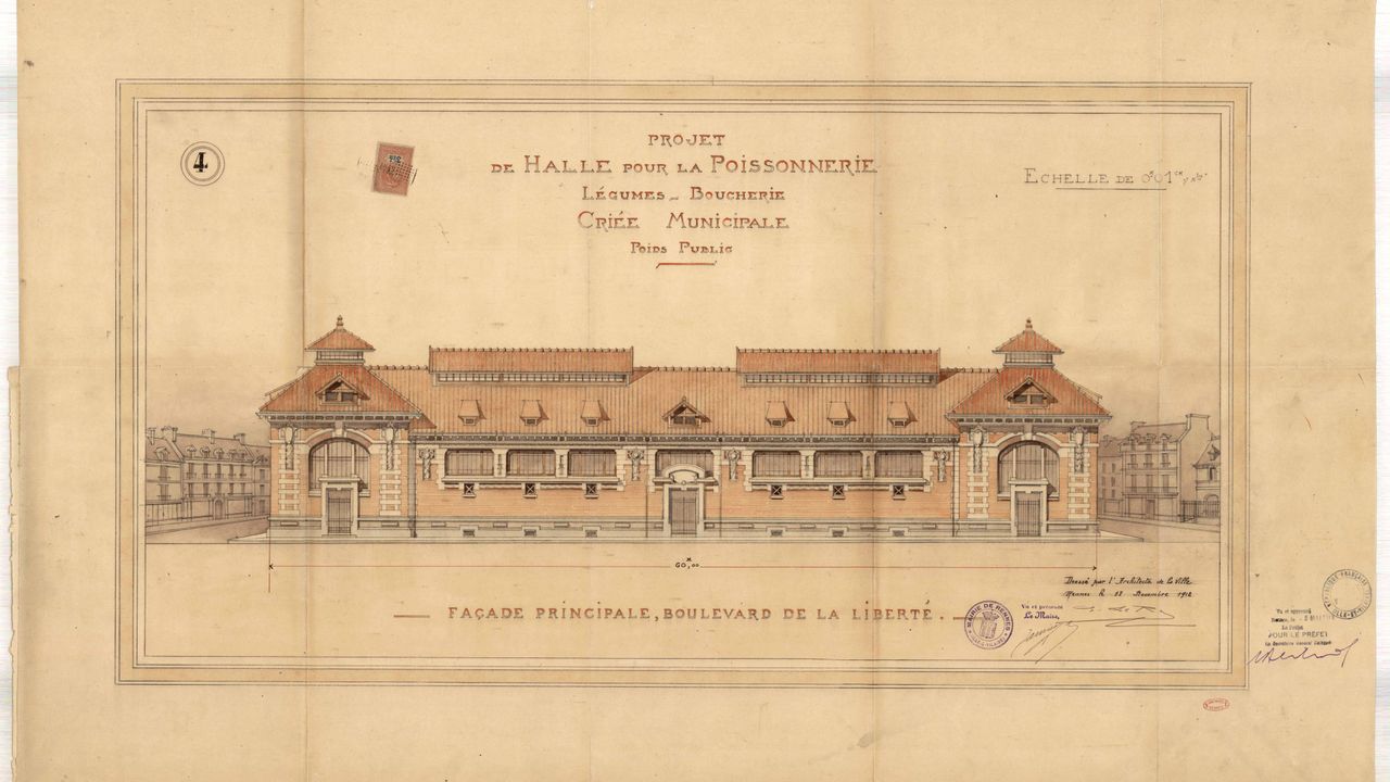The halles centrales building was designed by architect Emmanuel Leray. Inaugurated on April 29, 1923, its name on the pediment still reads « Criée municipale » (municipal fish auction), although the wholesale fish trade, and later the fruit and vegetable trade, ceased in the 1960s. The other parts of the building are still home to a daily food market.
