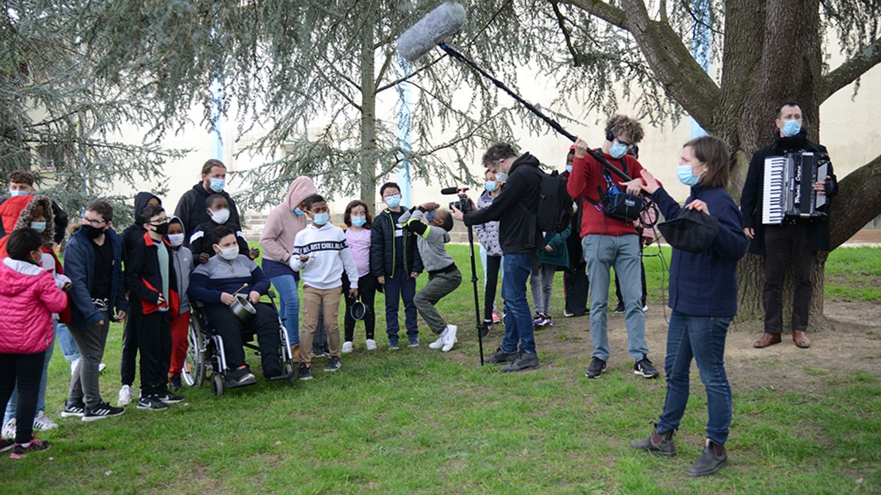 Les Moineaux de Trégain was created as part of artist Éléonore Saintagnan's residency at Trégain Elementary School in March 2021, with the collaboration of CM1-CM2 students, Florian Berutti as cinematographer, Pierre-Yves Dubois as sound recordist, and Gabriel Mattei as composer.
