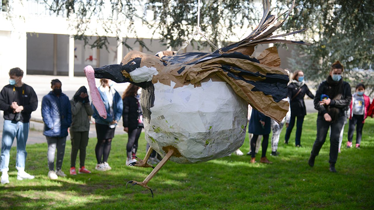 Éléonore Saintagnan invited the students to revisit this campaign scene, drawing inspiration from the aesthetics of Maoist propaganda posters and films. During the filming, the artist and students created drawn banners, a giant piñata in the shape of a bird, and songs about sparrows.