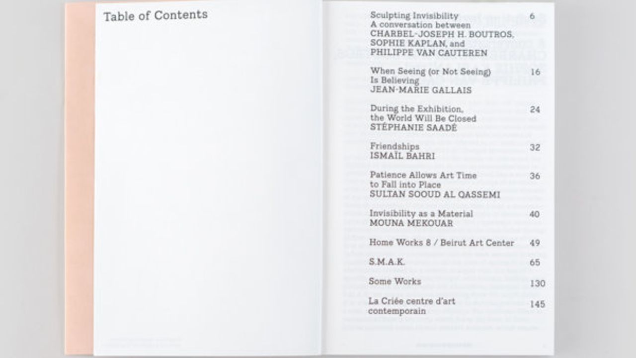 The image section, which follows the texts, brings together a selection of 70 visuals. These visuals are mainly views of works taken from the Beirut and S.M.A.K exhibitions, accompanied by about ten images of works important to the artist but not presented in these exhibitions. It comes with a detailed list of works and a second interview between him and Sophie Kaplan, in place of images from La Criée exhibition, which, due to deferrals related to the health crisis, could not be held before publication.