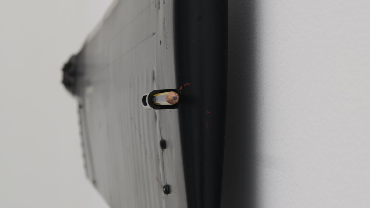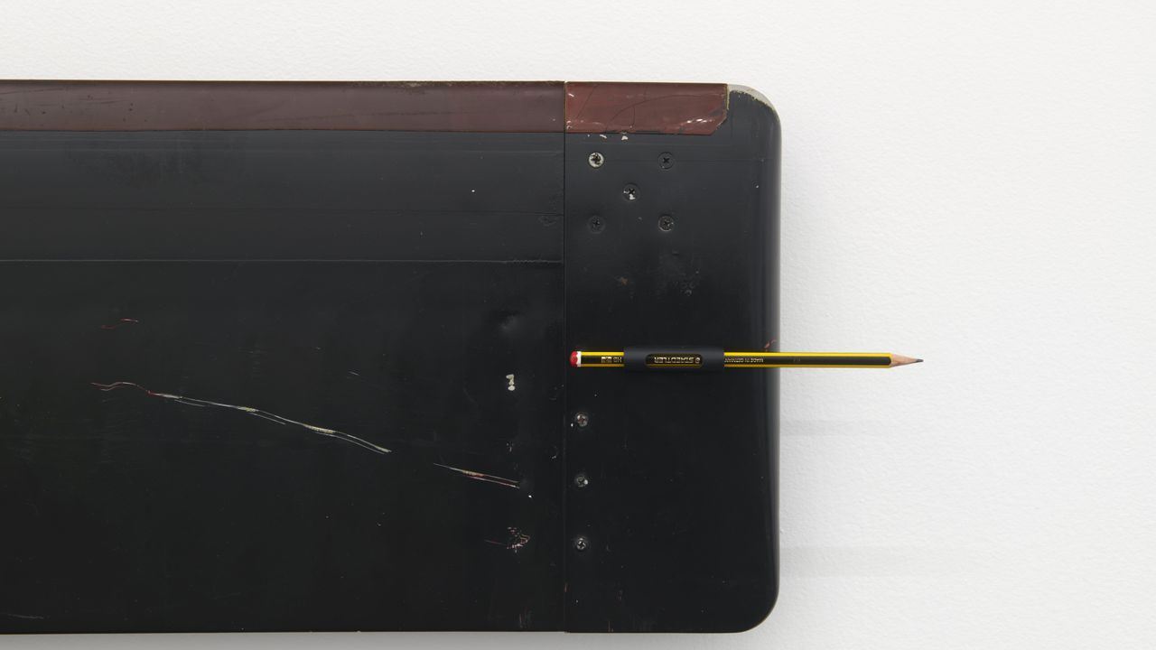Apocalypse and History, two works juxtaposed, include measuring tools. The conductor's baton sets the tempo of the music, and the architect's pencil sketches the dimensions of a space. These tools are associated with large and small helicopter blades that echo the centrifugal force of a cyclone. Presented here dismantled from their rotors, they are metaphors for the hour and minute hands torn from their clock. The titles also refer to narratives: the grand history of Mankind and the myth of the Apocalypse, the end of times. For Evariste Richer, the two pieces resonate with the history of art: from Dante's circles of Hell to Francis Ford Coppola's film Apocalypse Now.
