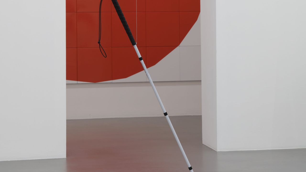 Monument à la dernière plume, presented in suspension, evokes opposing forces, between balance and imbalance, light and darkness. A lightning rod, composed of several conductive metal elements that capture lightning in a flash, is positioned as a counterbalance to a white cane, which symbolizes blindness. This 'monument,' both airy and unstable, summons the brilliance of the sky while highlighting absence (that of the bird and the last feather).