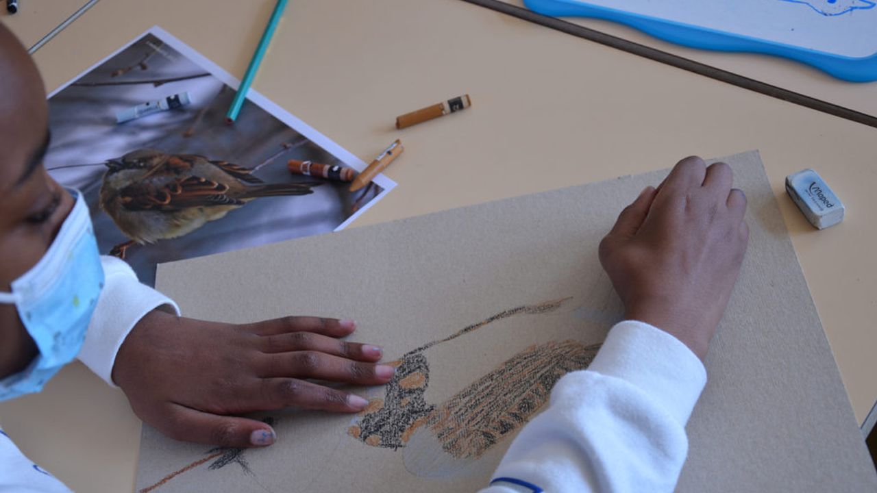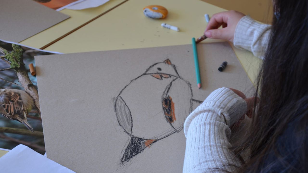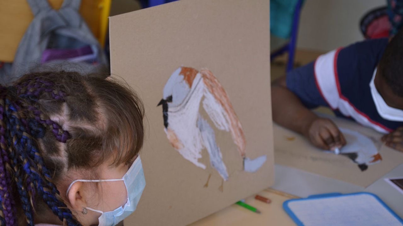 Suite à ça, les élèves ont pu reproduire le plus fidèlement possible les moineaux sur un carton plein qui servira de pancarte de manifestation. À l’aide de pastel gras, les enfants ont appris diverses techniques comme faire des aplats de couleur, des camaïeux ainsi que divers termes comme la réserve, le contraste.