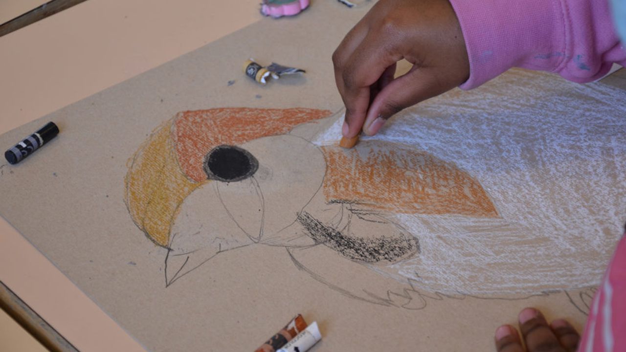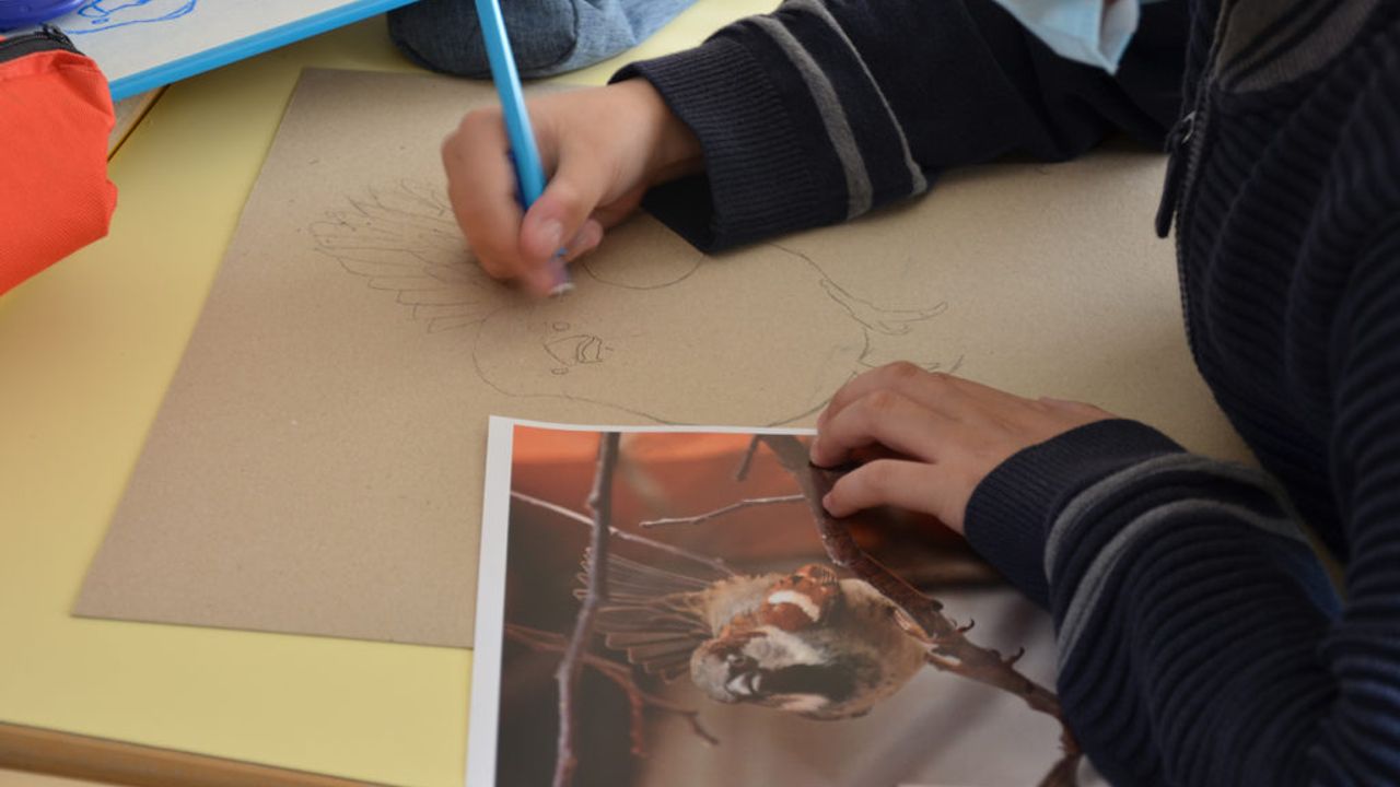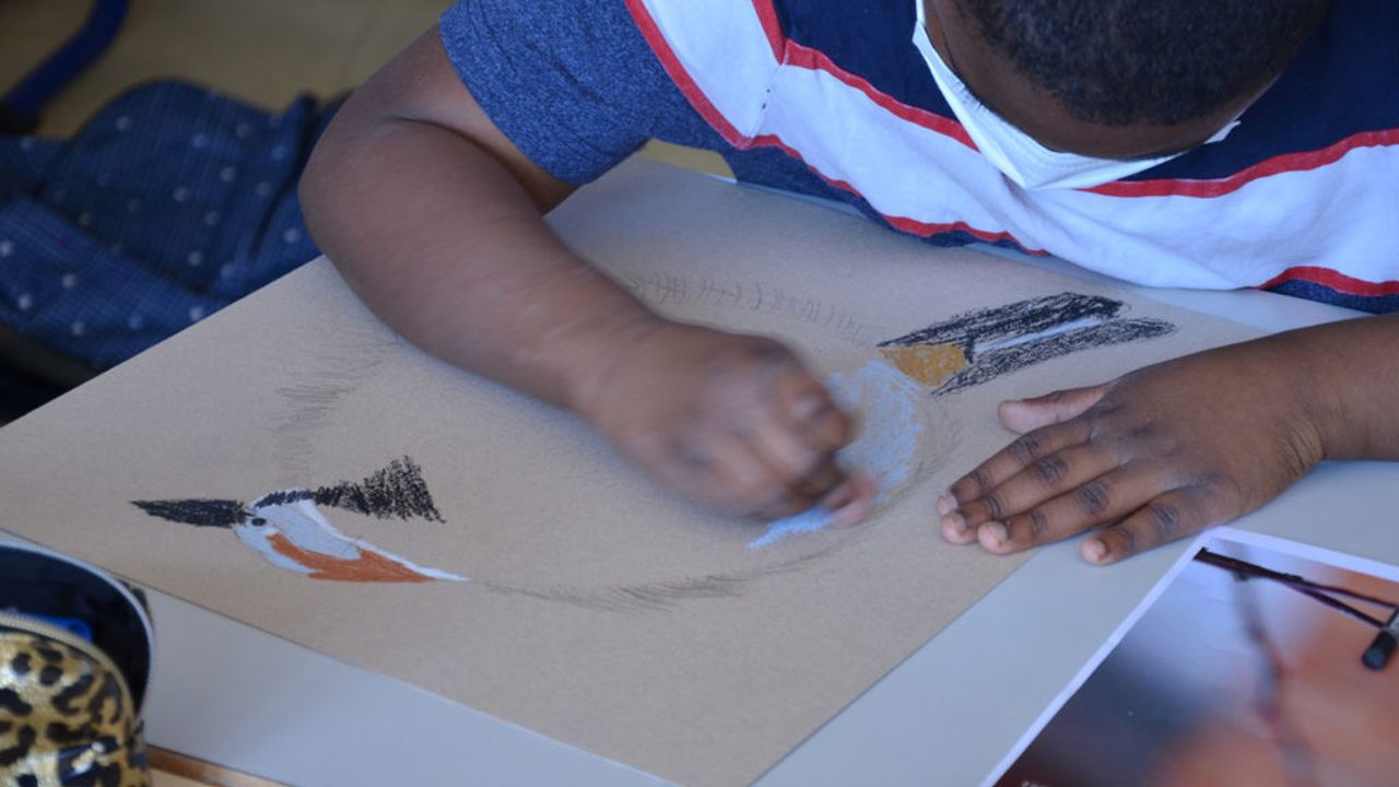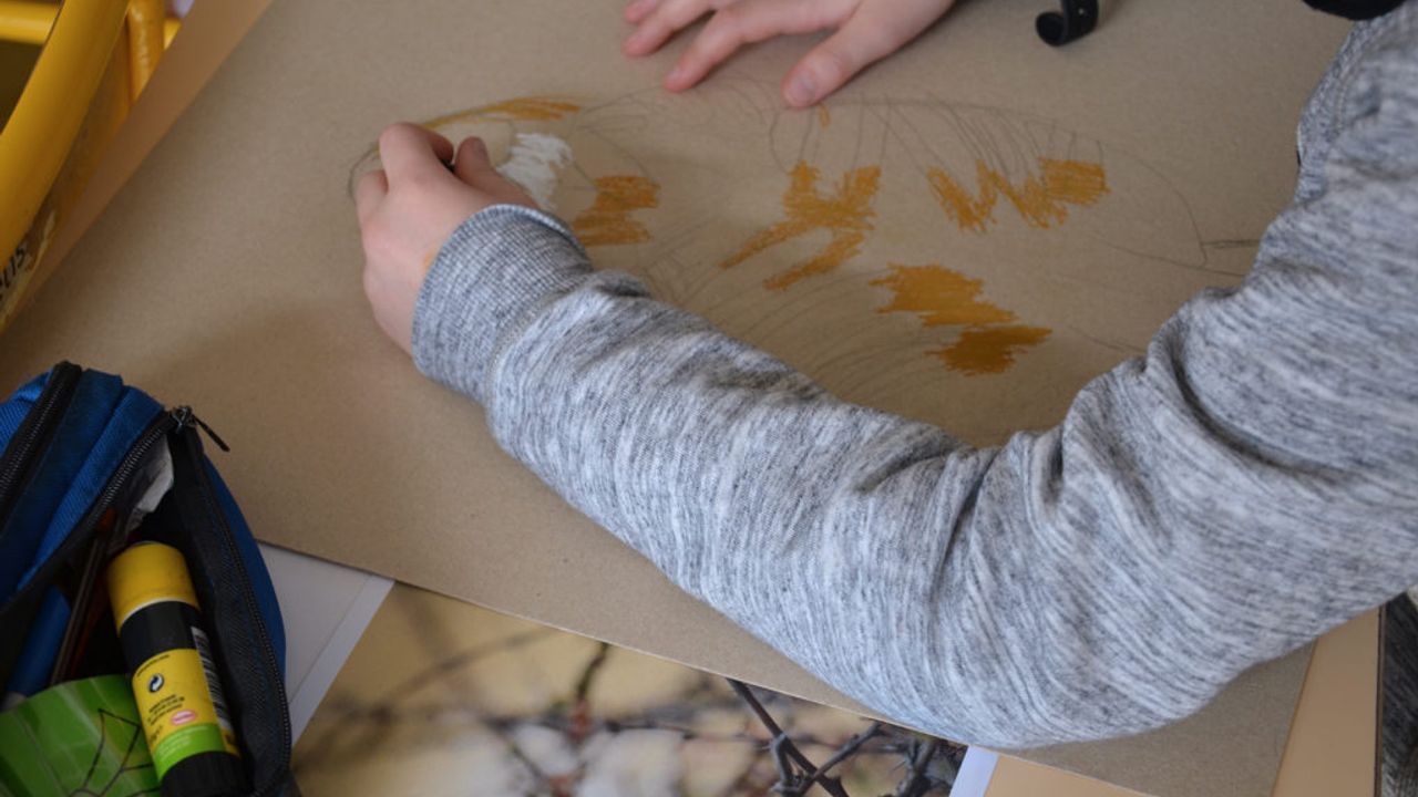 Suite à ça, les élèves ont pu reproduire le plus fidèlement possible les moineaux sur un carton plein qui servira de pancarte de manifestation. À l’aide de pastel gras, les enfants ont appris diverses techniques comme faire des aplats de couleur, des camaïeux ainsi que divers termes comme la réserve, le contraste.