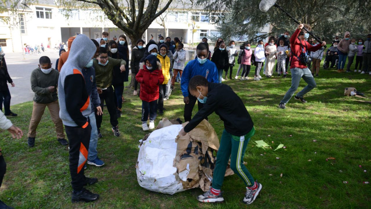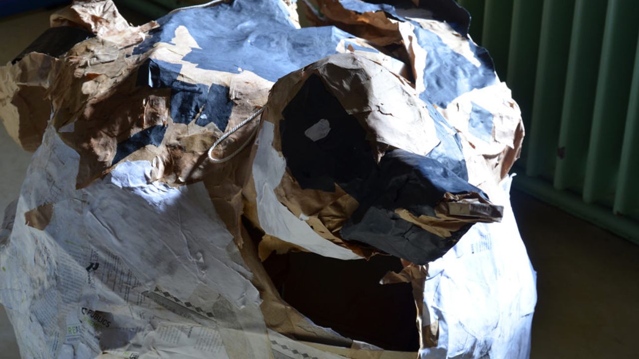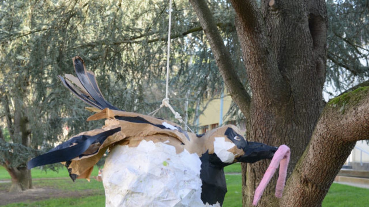 Au fil du projet Moineaux, en parallèle des ateliers chants, les élèves de CM1-CM2 de l’école Trégain sont venus en petits groupes afin de prêter main-forte à la construction d’une piñata géante.