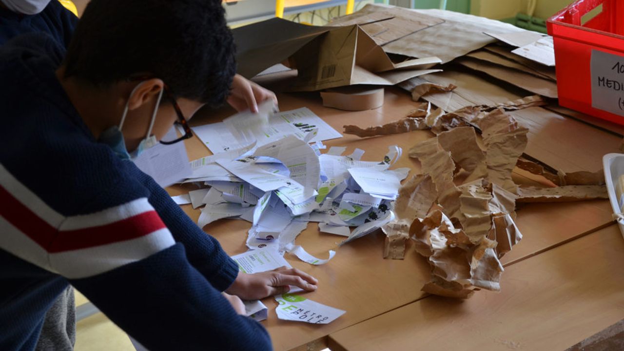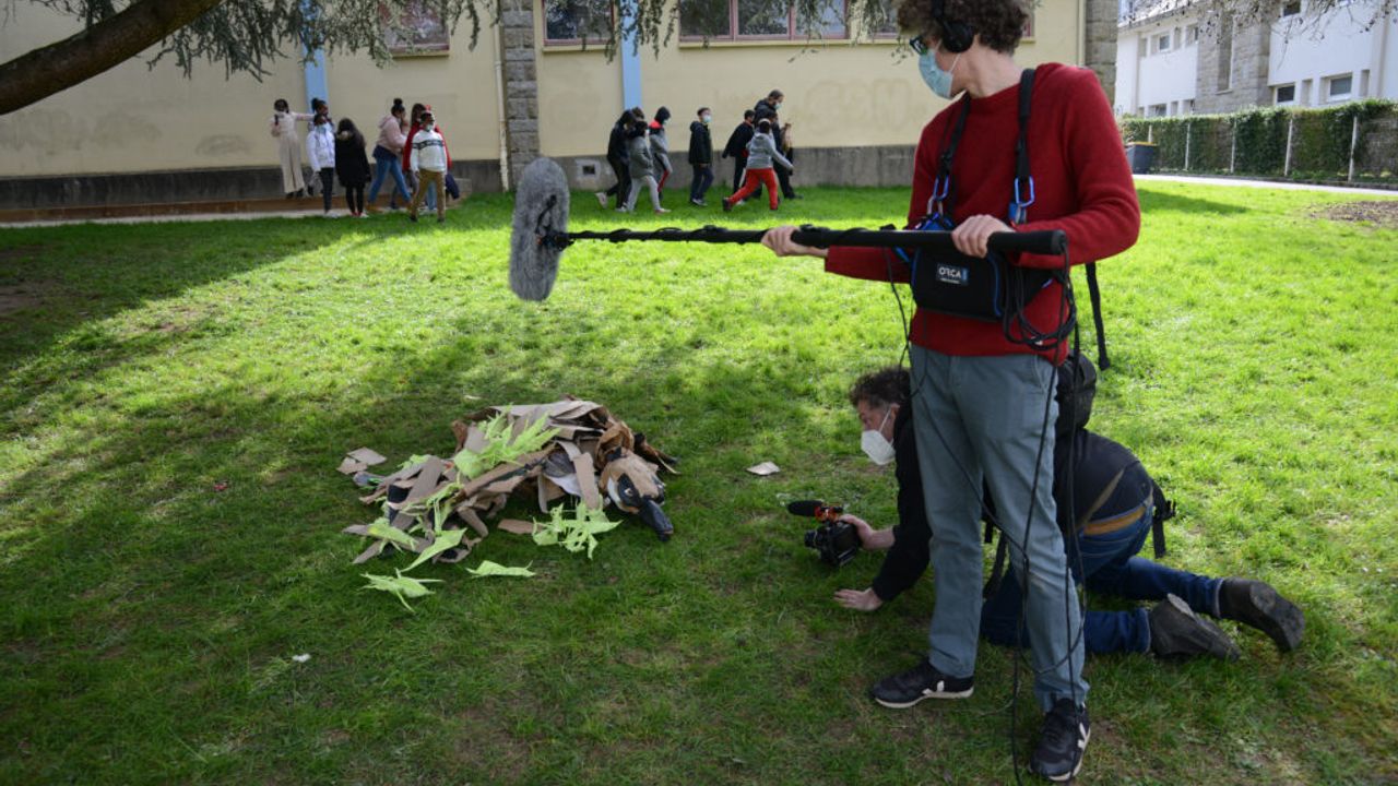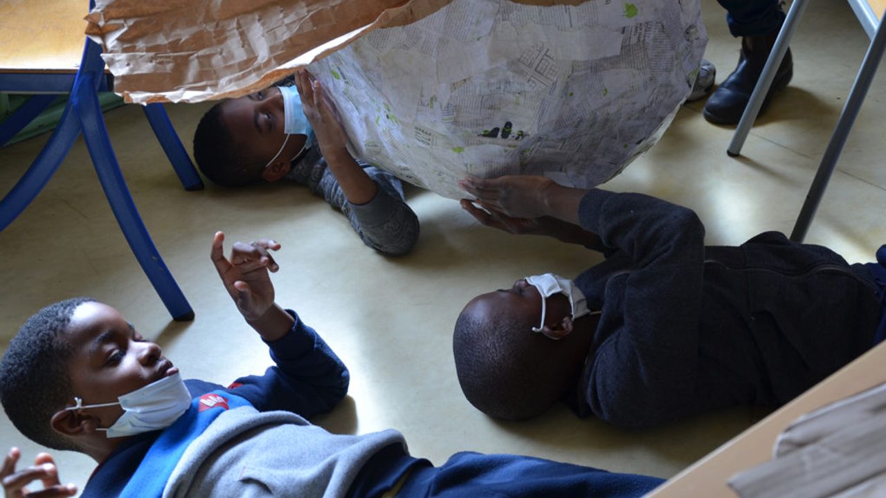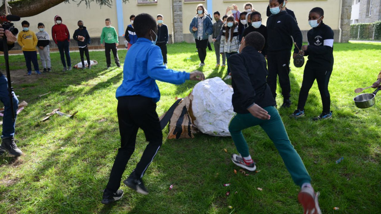 Au fil du projet Moineaux, en parallèle des ateliers chants, les élèves de CM1-CM2 de l’école Trégain sont venus en petits groupes afin de prêter main-forte à la construction d’une piñata géante.