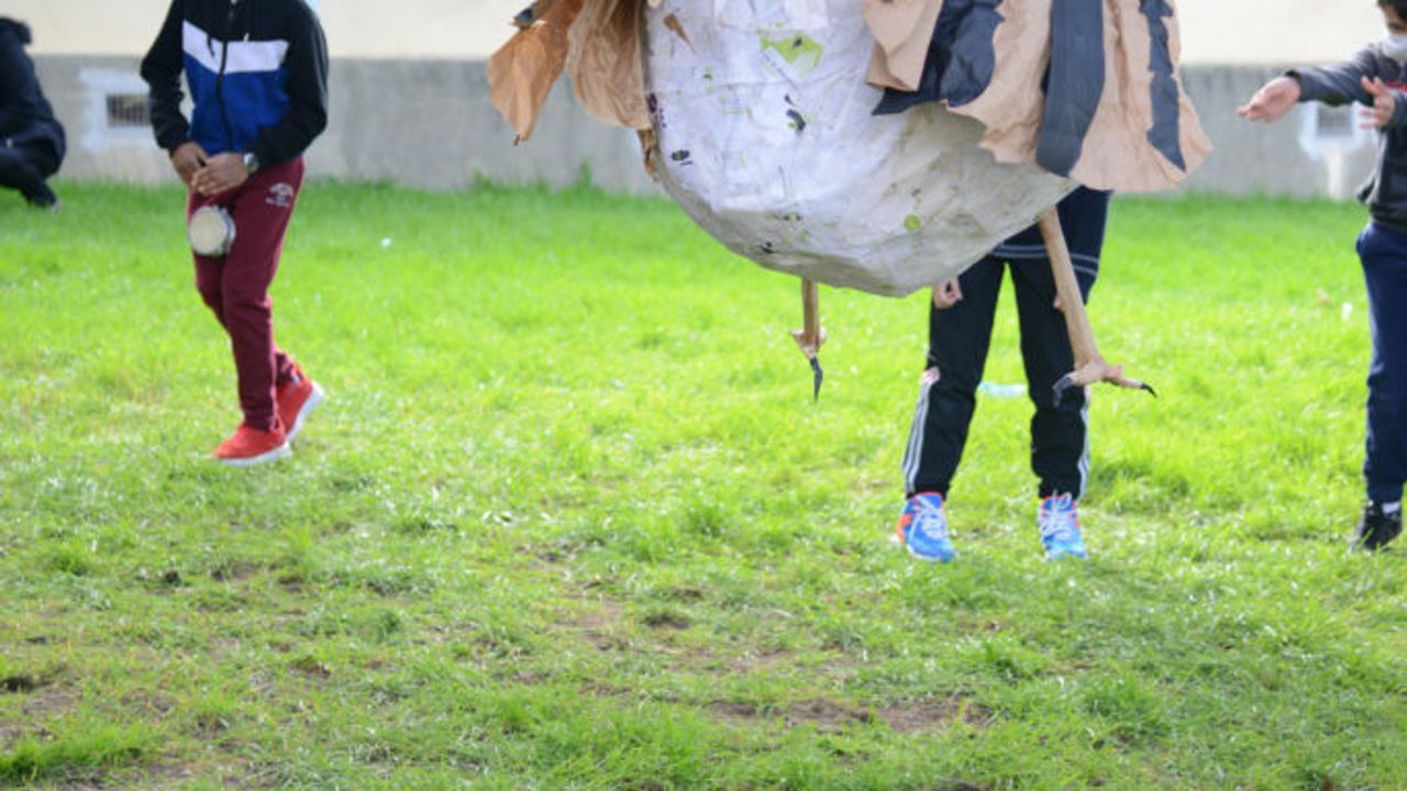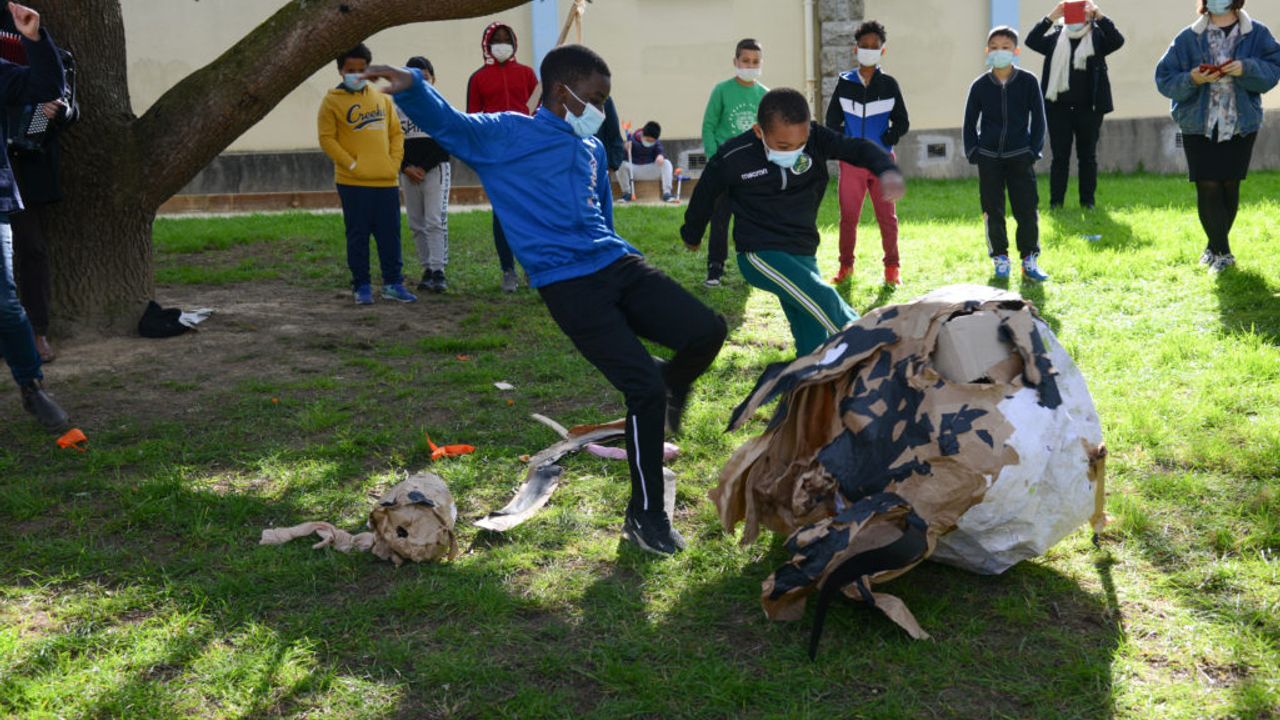 Après l’étape de fabrication, nous avons convenu d’un emplacement en plein air avec suffisamment d’espace pour accueillir les 4 classes du projet. Une fois la piñata géante accrochée à une branche d’arbre, un tir au sort a été établi, si l’élève entendait son nom, son rôle était alors de frapper de toutes ses forces la piñata afin de libérer les sauterelles (.. et quelques bonbons) ! Pendant ce temps, l’ensemble de la cohorte des CM1-CM2 scandait la chanson « Un moineaux dans mon panier » au rythme de l’accordéon de Gabriel Mattei et des casseroles, tambours et percussions de toutes sortes.