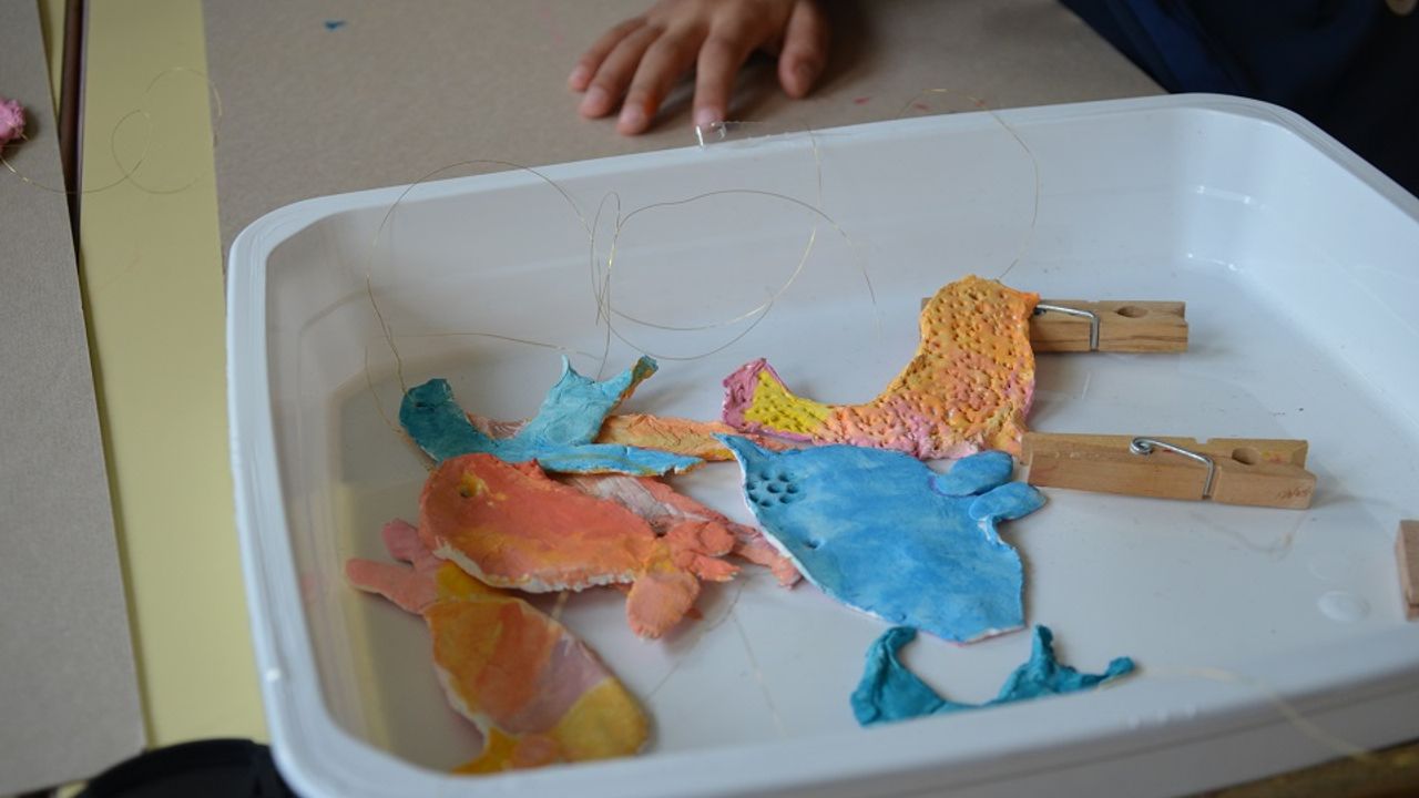 Il y a également eu en écho avec l’exposition de Katia Kameli, la fabrication de petits oiseaux en terre que nous avons d’ailleurs pu décorer pendant l’atelier avec les encres.