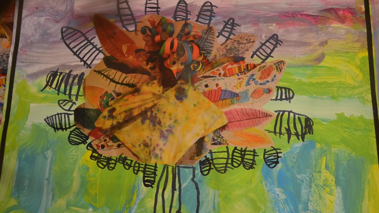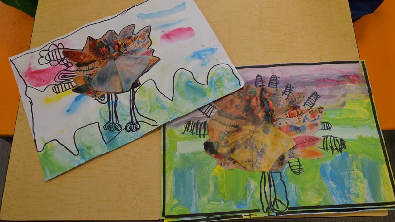 Les élèves de la première classe ont créé leur propre histoire à partir des photographies d’eux vêtus de costumes d’oiseaux qu’ils ont fabriqué. Derrière eux, ils ont imaginé les 7 vallées avec de nombreuses encres de couleur.