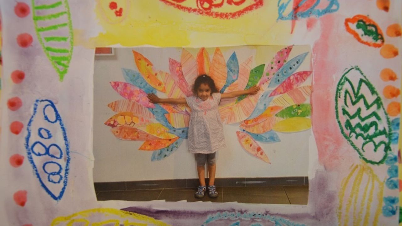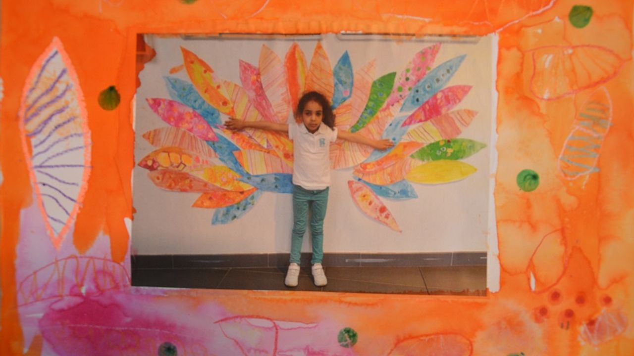 Les enfants de la deuxième classe se sont photographiés devant des plumes qu’ils ont créés. Ils ont également peint des couleurs et des formes derrières eux.