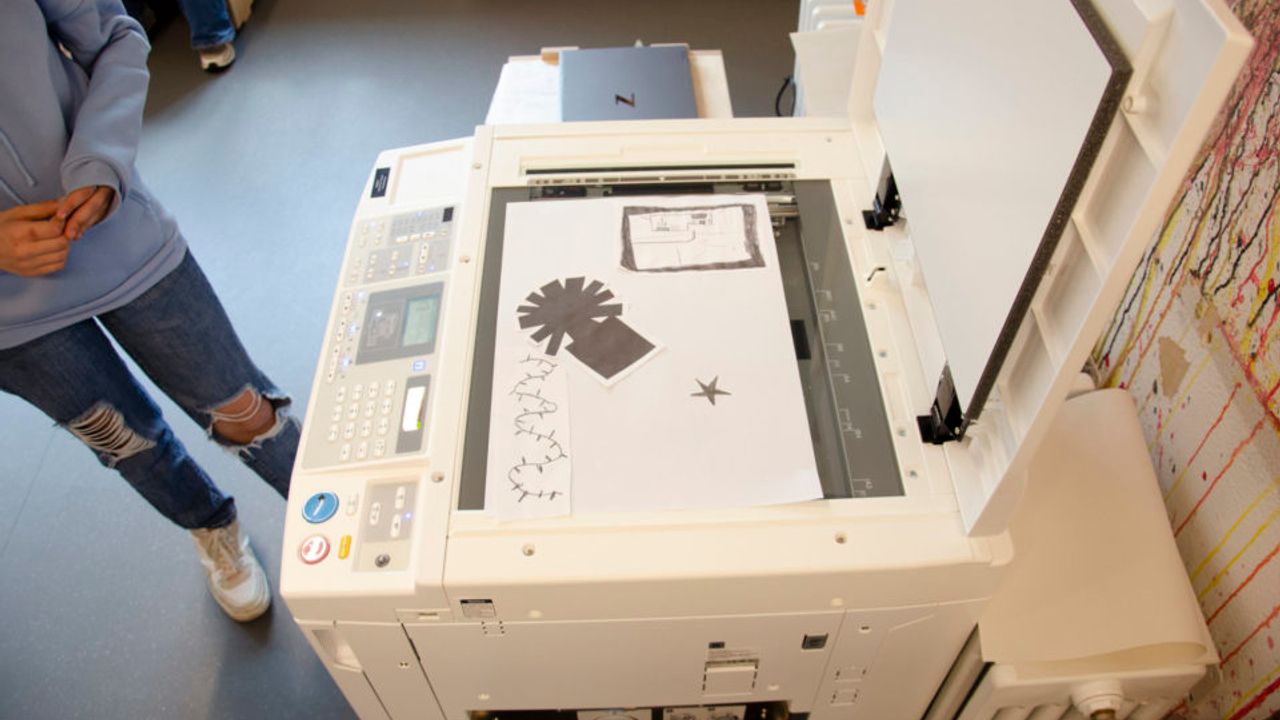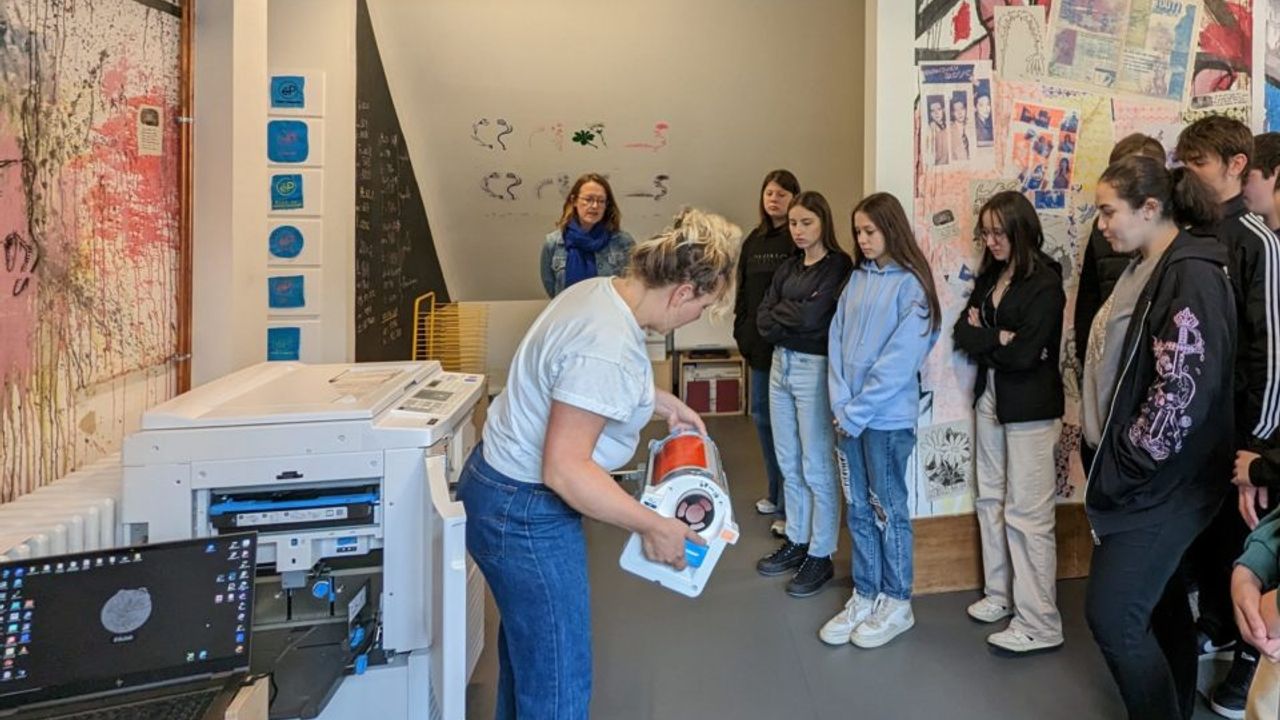 La première partie de la journée a été l’occasion pour les élèves de découvrir le fonctionnement de l’impression en risographie. D’abord grâce aux explications de l’artiste Fanny Martel puis par la pratique. Nous avons imprimé le côté texte du petit livret (le fanzine se compose de deux livrets l’un dans l’autre). Pour ce faire, il a fallu trois passages à l’impression risographique : d’abord à l’encre orange, puis dorée, et noire pour terminer. Malheureusement la machine nous a causé quelques problèmes mais l’entrain des élèves nous a permis de ne pas prendre trop de retard.