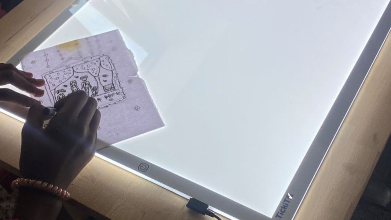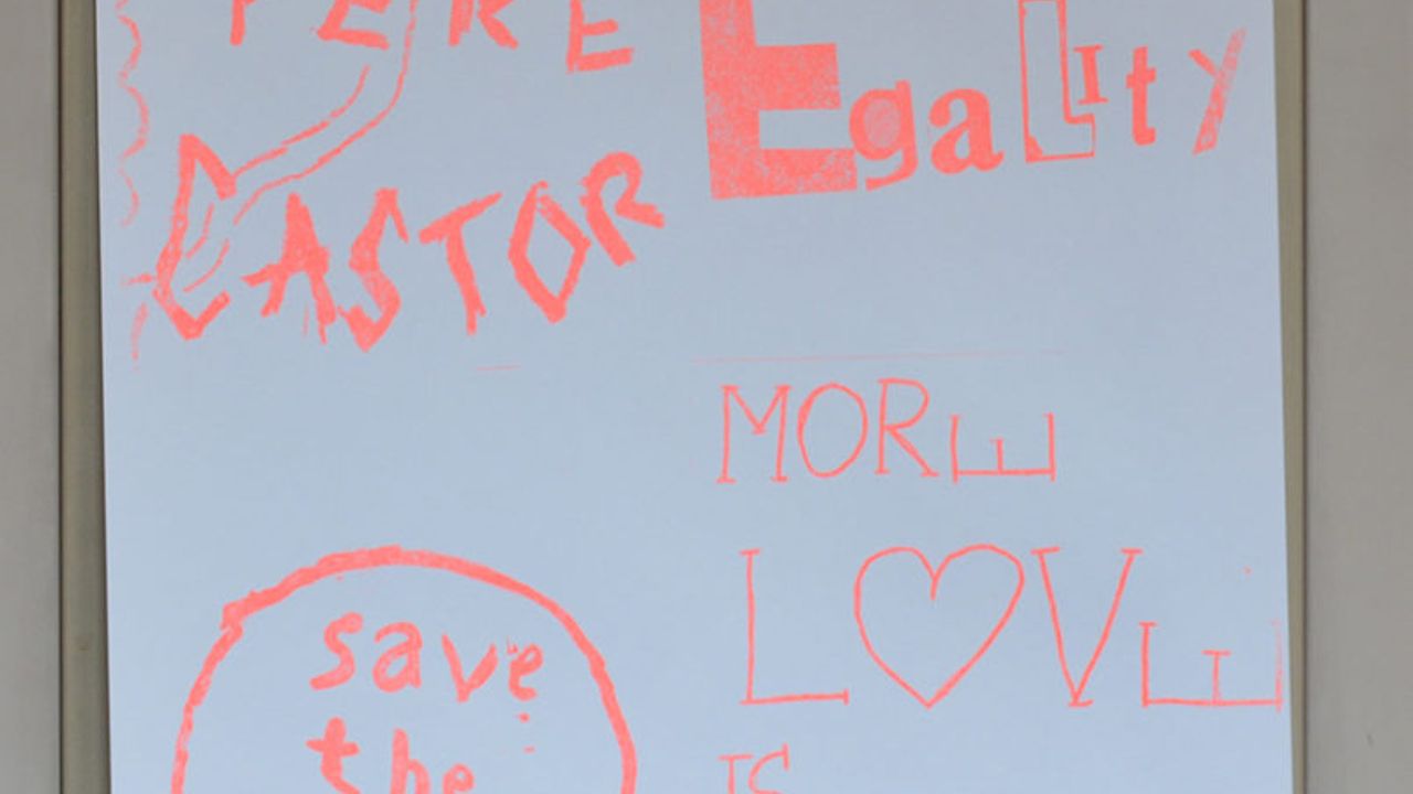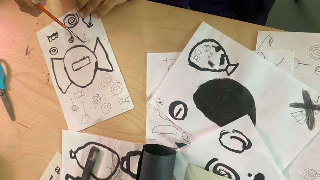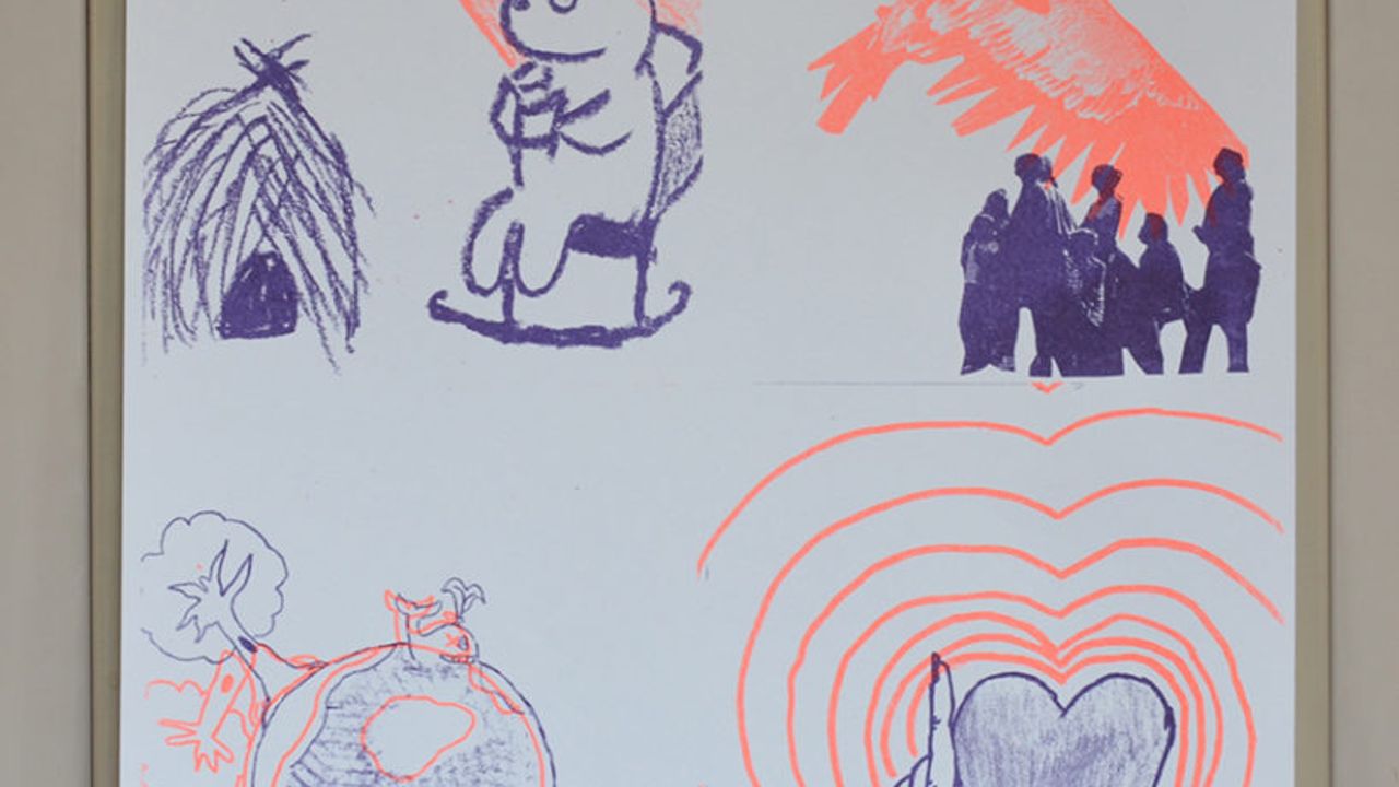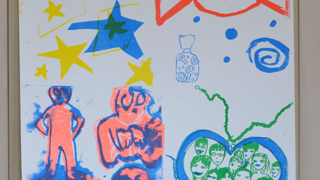 En quatre groupes et dans une logique de coopération afin de s’accorder sur les choix graphiques, les enfants s’expriment avec plusieurs techniques : craie grasse, encre de chine, papiers découpés, avant impression finale avec le duplicopieur Riso. Ces ateliers sont l’occasion pour les enfants d’envisager le travail de Jeremy Deller par la pratique, et se concluent par une présentation du résultat du travail commun des classes sur les affiches. Chacun repart ensuite avec ses deux exemplaires !