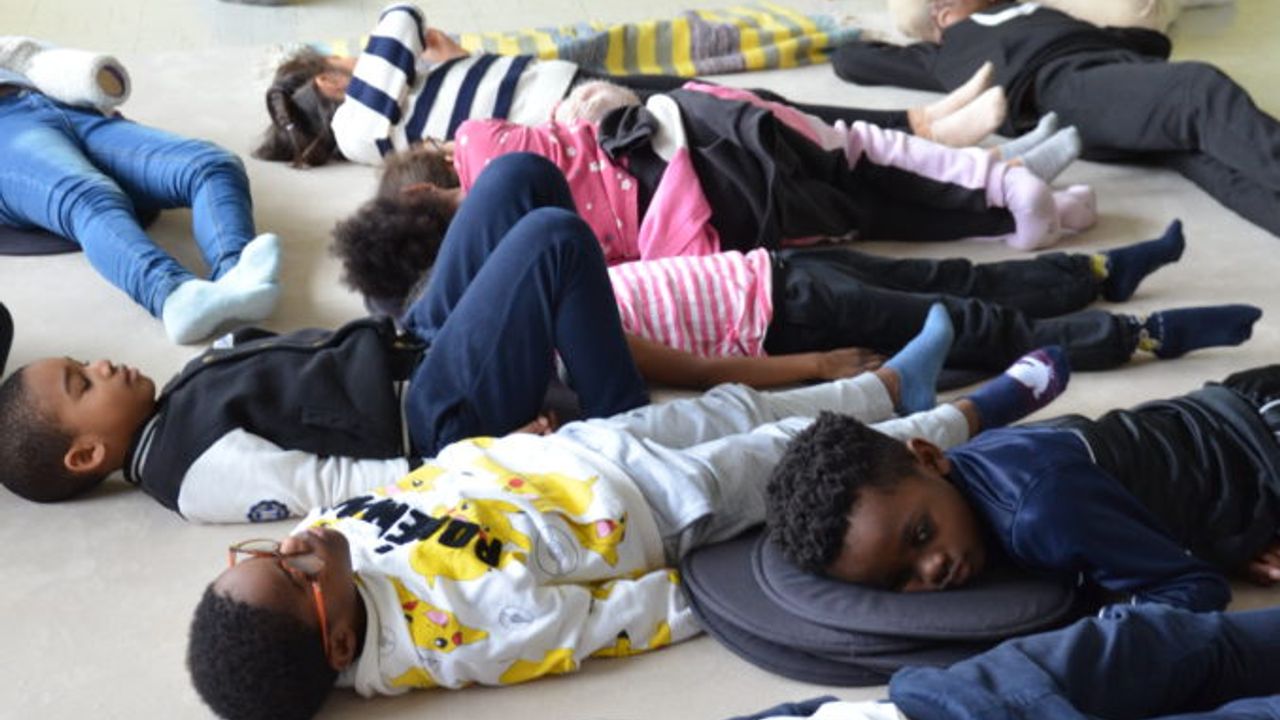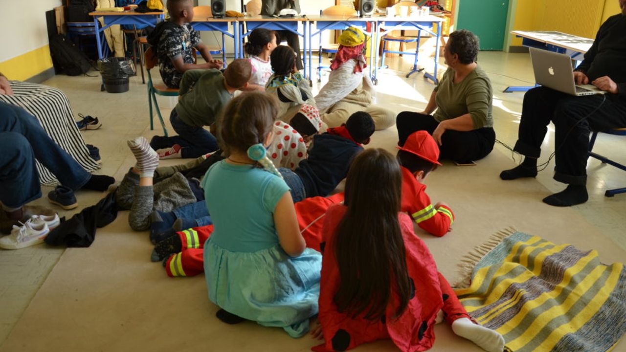 Vient ensuite le moment tant attendu par les enfants de la pratique. Comme ils l’ont fait avec les couleurs et les formes, les enfants vont aujourd’hui jouer avec les nuances des sons. Pour cet atelier spécial, Fabrice est venu avec des instruments de musique de sa collection personnelle.