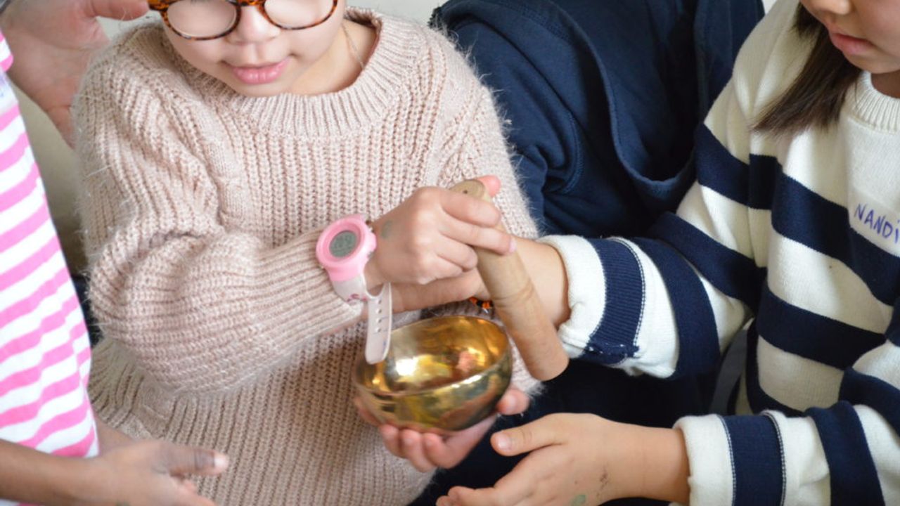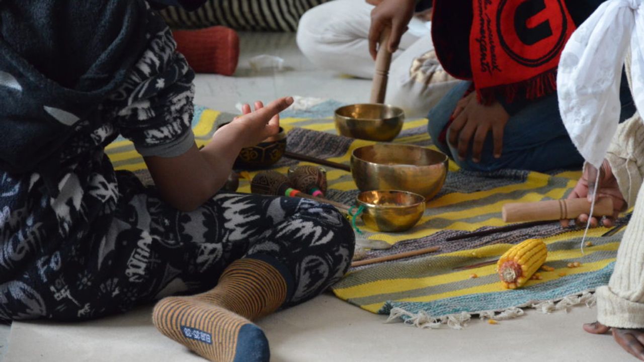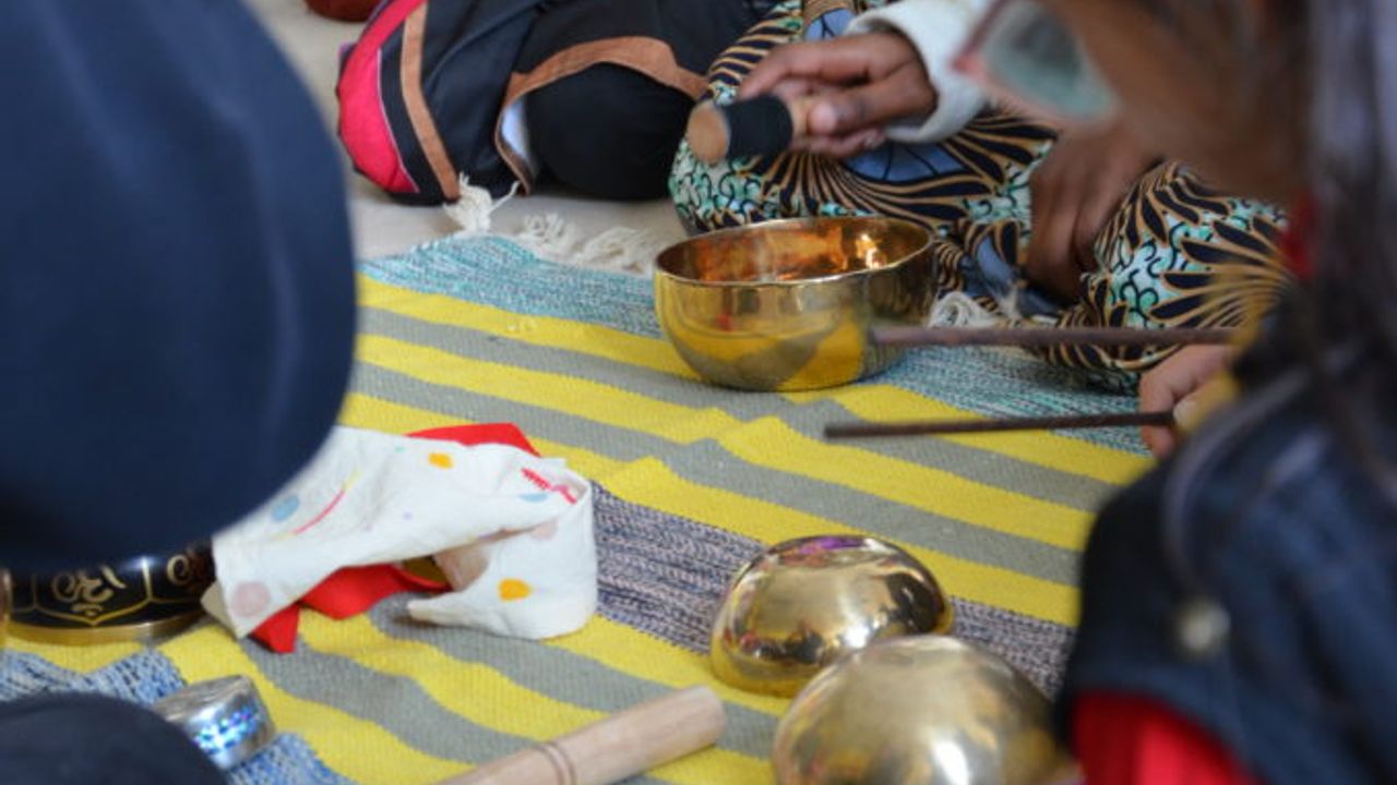 Une série d’une quinzaine d’instruments est répartie sur un petit. Le musicien commence par leur présenter les différents instruments qu’il a amenés. Il commence par faire sonner les bols tibétains qu’il a apportés. Leurs vibrations résonnent dans la pièce et calment immédiatement les esprits.