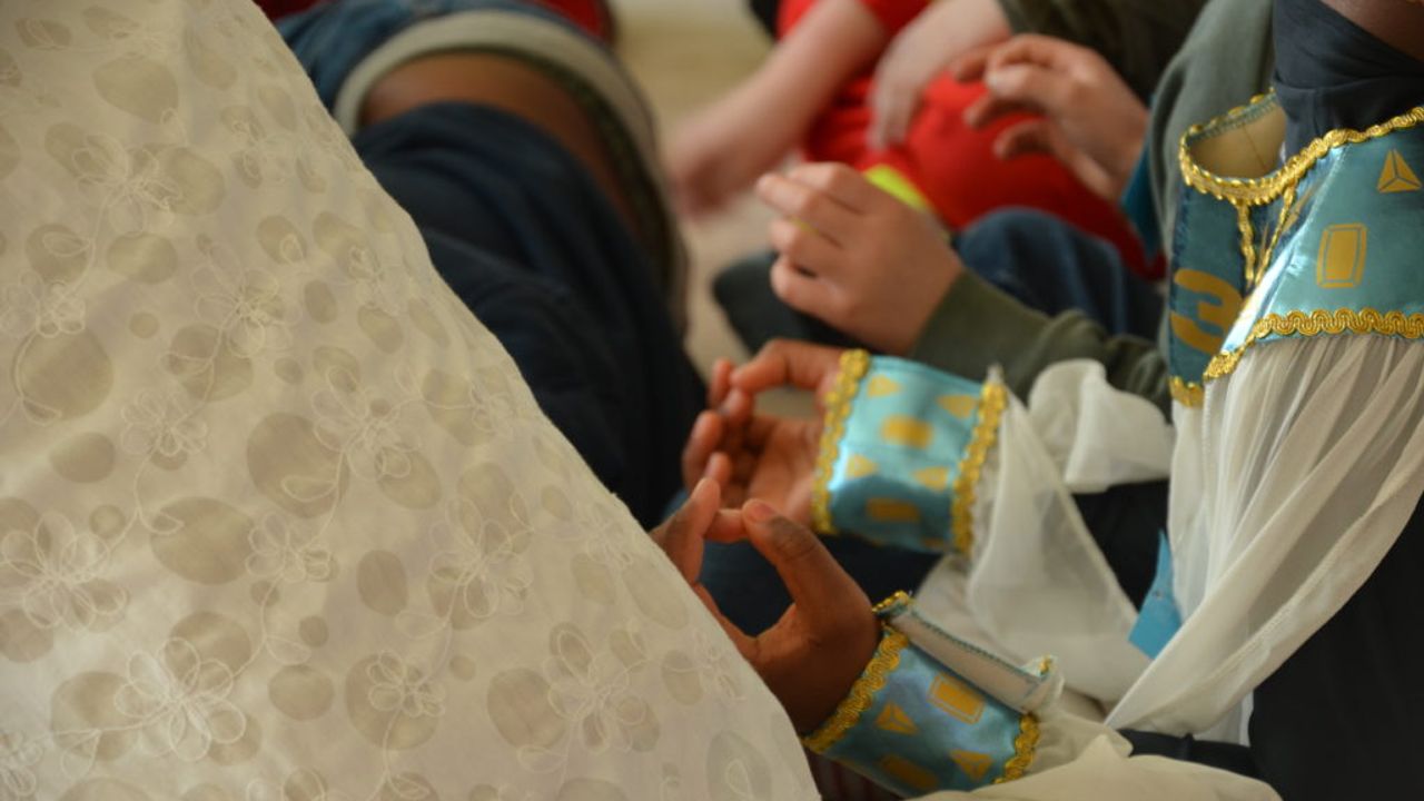 Les instruments peuvent être faits de matières différentes : en pierre, en bois, en métal… Fabrice leur a amené des instruments qui montrent cette diversité. Il explique aux élèves que les maracas qu’il a amenées font partie de la famille des sonnailles, tout comme la petite boîte contenant du riz qui se trouve aussi sur le tapis. Ces maracas-ci sont précieuses, car elles viennent du Pérou ou elles appartenaient aux chamans du peuple Sipibo.