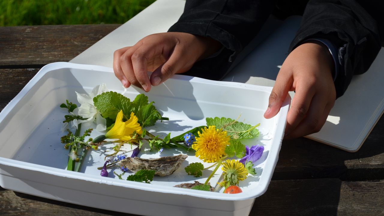 Chaque binôme reçoit une barquette de collecte et commence à explorer les alentours. En suivant le chemin, ils ramassent leurs premiers trésors : des cosses de fèves, des fleurs de toutes les couleurs, des feuilles de toutes les formes, des cailloux de différentes tailles, mais aussi quelques déchets dissimulés dans les herbes. La coquille de moule ou le papier de bonbon deviennent des trésors dans les barquettes des enfants.