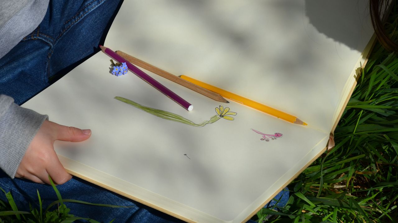 Armés de crayons de couleurs et de bois, les enfants doivent maintenant réaliser des dessins d’observation dans leur carnet Certains choisissent de dessiner ce qu’ils ont trouvé et ramassé, d’autres préfèrent se placer directement devant leur sujet. Certains s’installent sur des bancs ou des tables, d’autres préfèrent s’asseoir dans l’herbe malgré la présence d’insectes.