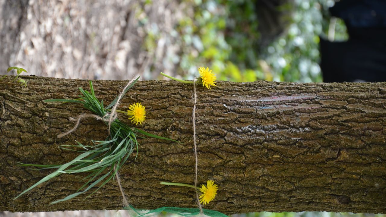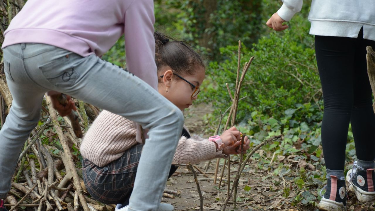 Gabrielle les rassemble pour leur expliquer les consignes : prolonger l’atelier précédent en fabriquant des offrandes pour la nature. Ils se répartissent en petits groupes selon leurs affinités, choisissant un arbre autour duquel construire leur petite sculpture. Avec les matériaux trouvés sur le sol de la forêt – morceaux de bois, feuilles, herbe, ficelle – et l’aide des adultes présents, ils donnent vie à une dizaine de constructions variées. Certains créent des tipis avec des morceaux de bois, d’autres ajoutent des éléments aériens avec des pâquerettes et des pissenlits, tandis que certains utilisent des feuilles pour embellir leurs créations.
