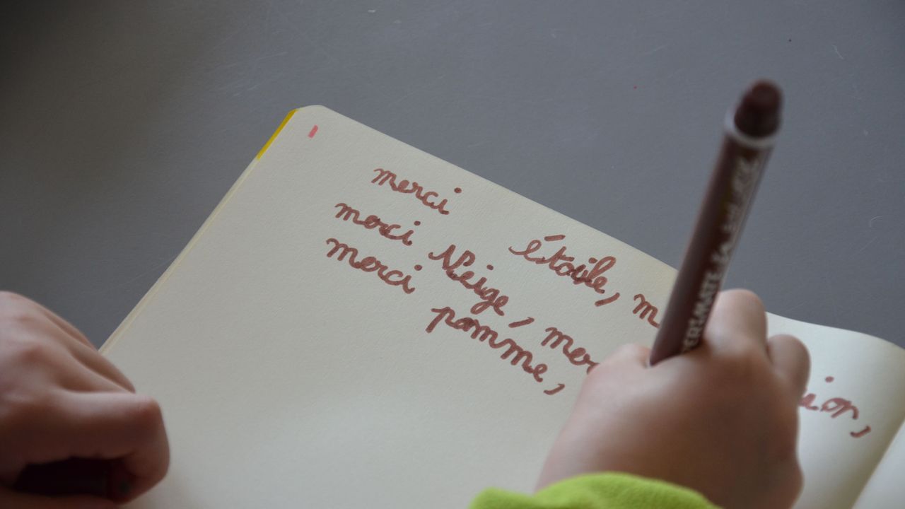 Les élèves se mettent alors à écrire les phrases dans leur carnet. On voit que certains s’influencent mutuellement, « Merci les lapins » se retrouve noté dans les carnets de toute la rangée. Si certains écrivent en monochrome, d’autres dessinent les choses qu’ils remercient à chaque fois, d’autres encore écrivent une lettre de chaque couleur. Quelques-uns parviennent à varier leurs remerciements en trouvant des idées particulièrement originales comme « Merci les tilleuls », plusieurs d’entre eux préfèrent citer des catégories d’animaux comme « Merci les félins ».