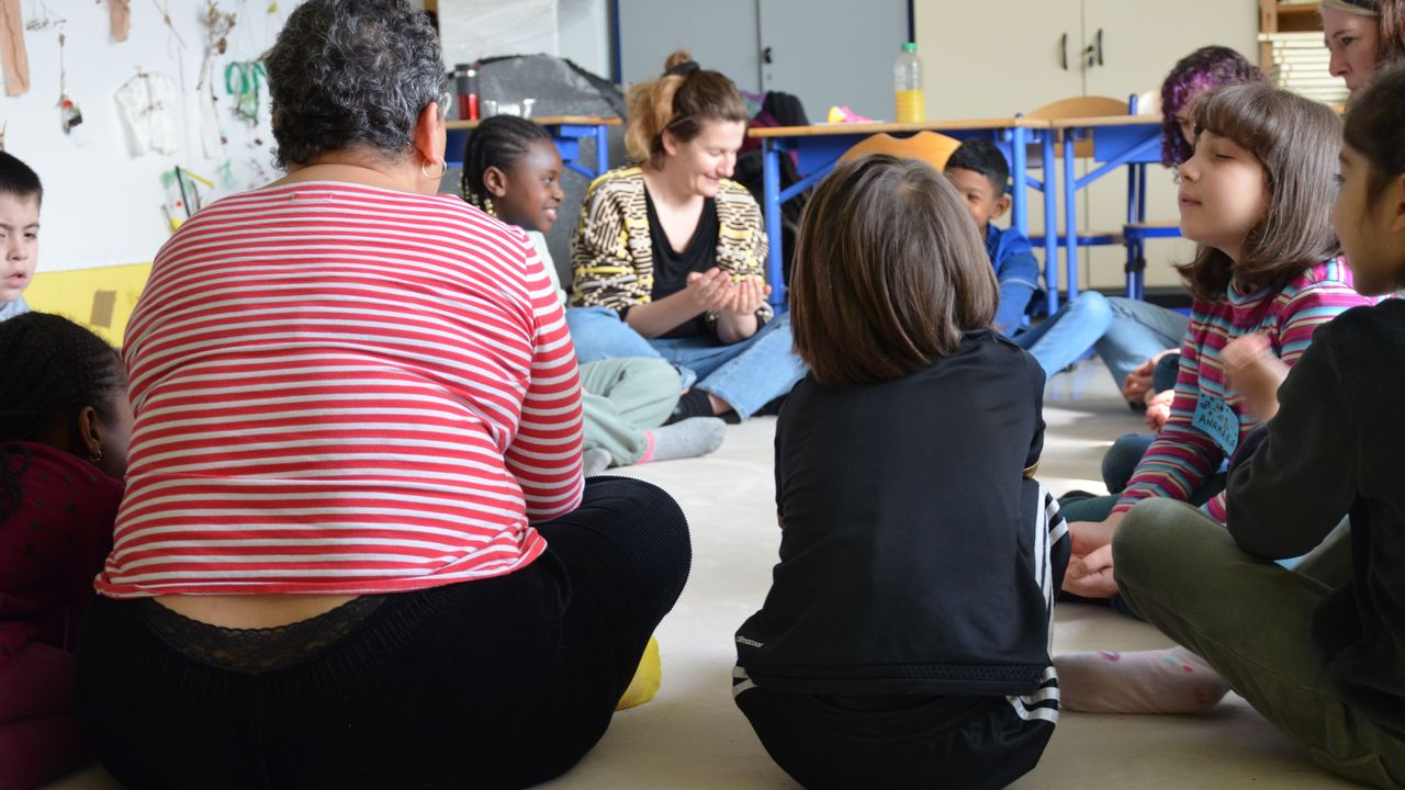 Avant d’entamer l’exercice et pour stimuler leur imagination, Gabrielle leur demande de former un cercle sur le tapis. Elle leur indique ensuite de former un réceptacle avec leurs mains et de fermer les yeux. Puis, elle leur propose d’imaginer, au creux de leurs mains, un petit animal. Les enfants qui le désirent énoncent quel animal ils ont entre leurs mains : un papillon, un tigre, un serpent…