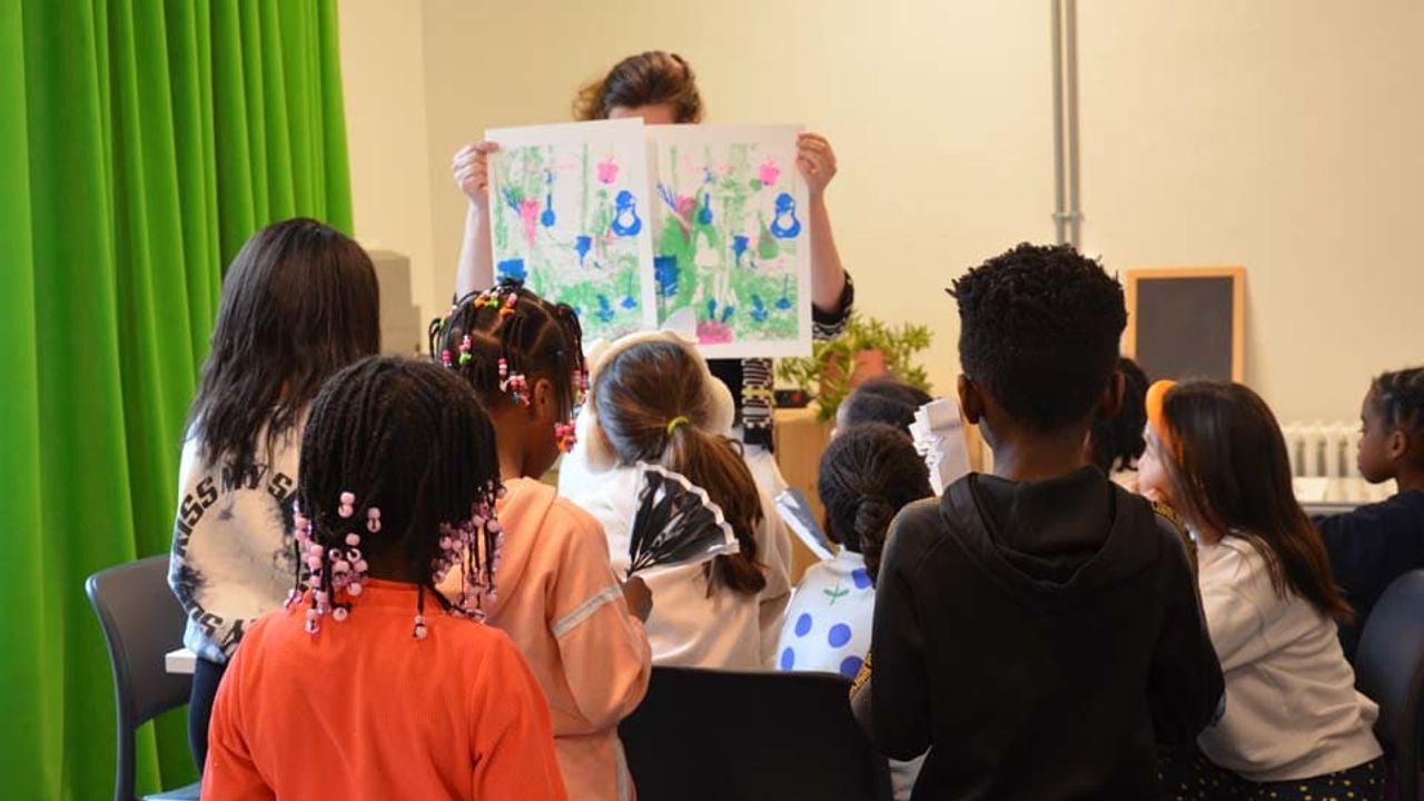 La première partie de l’atelier est l’occasion pour les élèves de revenir sur les thématiques abordées lors des ateliers sur le temps scolaire et pour certains de découvrir l’univers de Gabrielle Manglou. L’artiste prend ensuite le temps d’expliquer la technique d’impression en risographie à l’aide d’exemples d’affiches montrés aux enfants. Les affiches qu’ils vont concevoir se basent sur les photographies polaroid réalisées lors des ateliers.