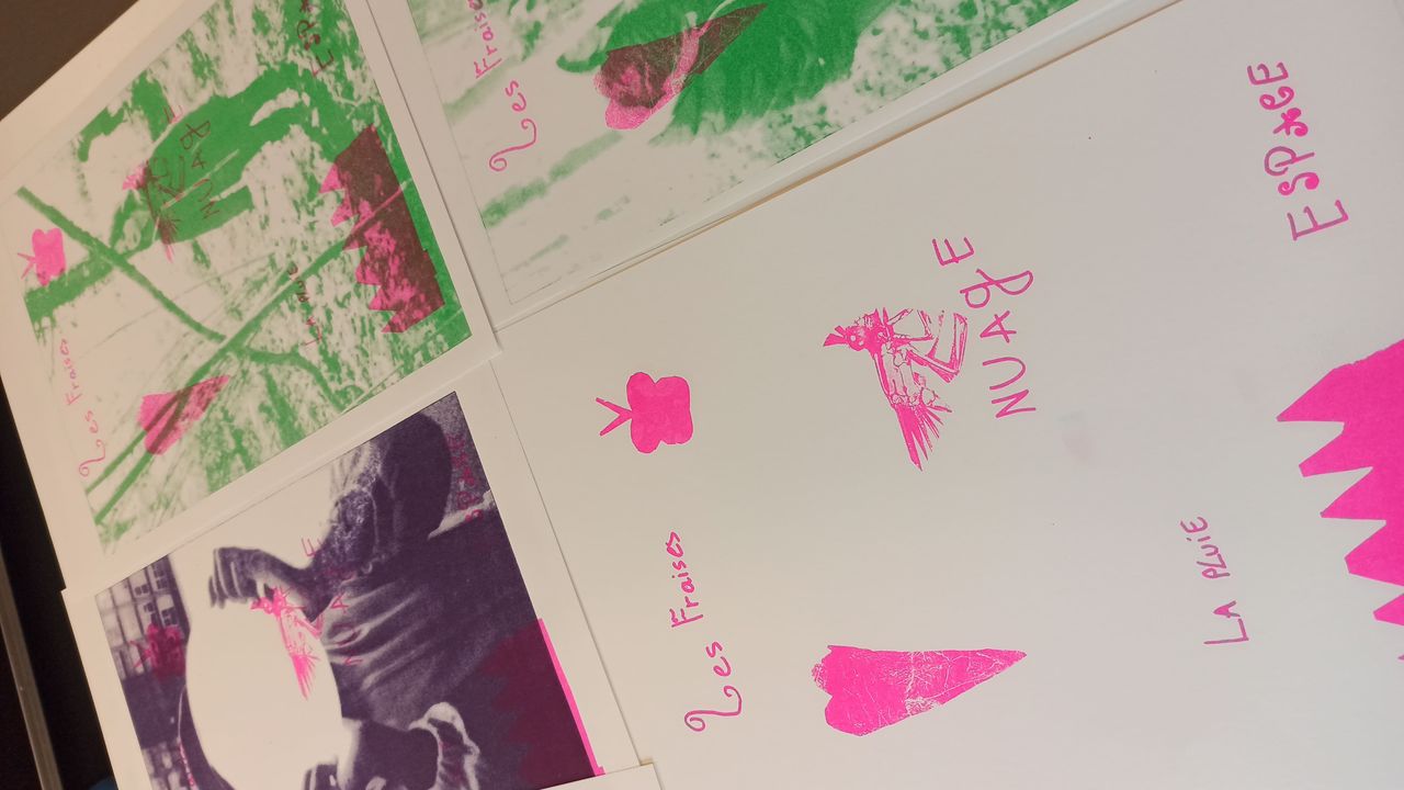 Une fois les impressions prêtes, elles sont disposées pour être observées par tous, permettant à l’encre fraîche de sécher, bien que celle de la Risographie ne sèche jamais entièrement. Les enfants reçoivent chacun un exemplaire des affiches créées. Les éléments créés lors des ateliers seront exposés à la maison de quartier de Villejean du 21 au 28 mai 2024, sous le titre Les enfants-paysages.