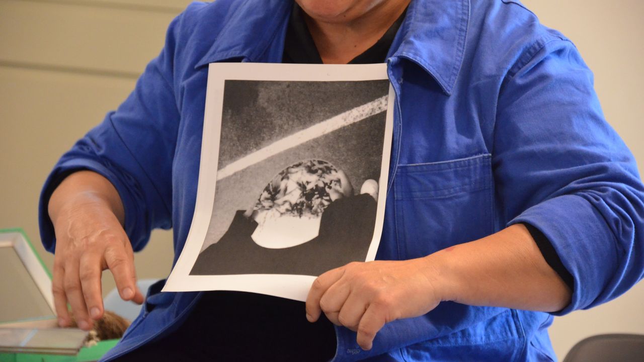 spécifique : découper des formes dans des magazines, écrire des éléments de la nature et plier des copies en noir et blanc des polaroids agrandis. Les éléments ainsi créés sont disposés au