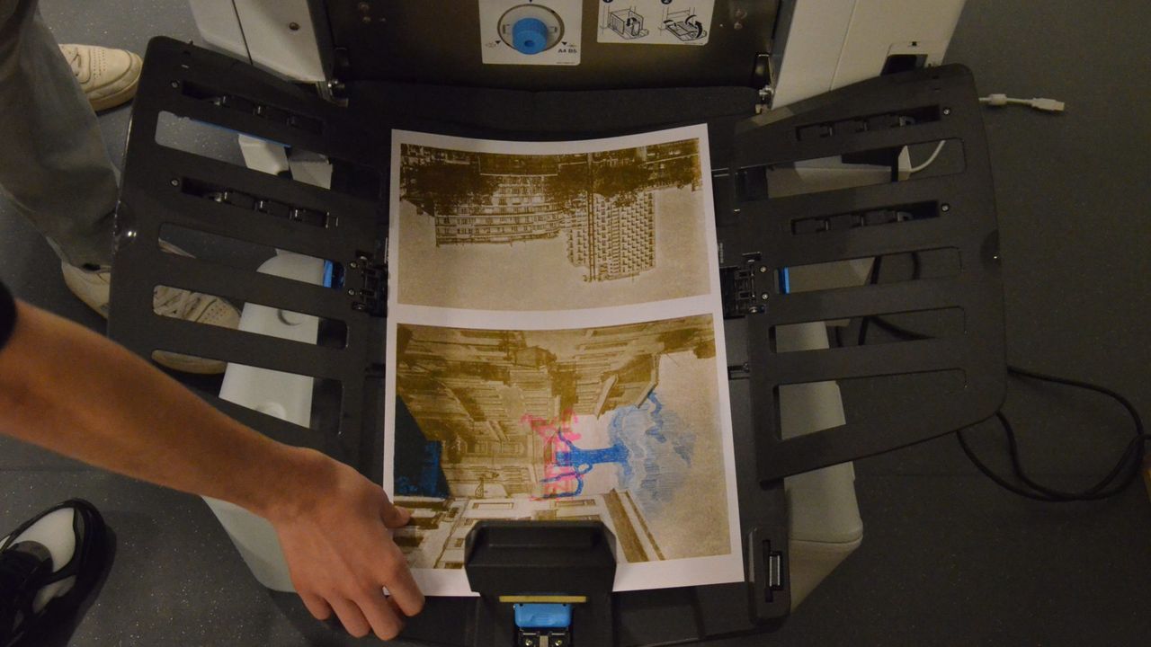 La semaine d’après, les étudiant·e·s se sont retrouvé·e·s à l’édulab de l’Hôtel Pasteur pour réaliser leur risographies à partir de cette photo imprimée en encre dorée.