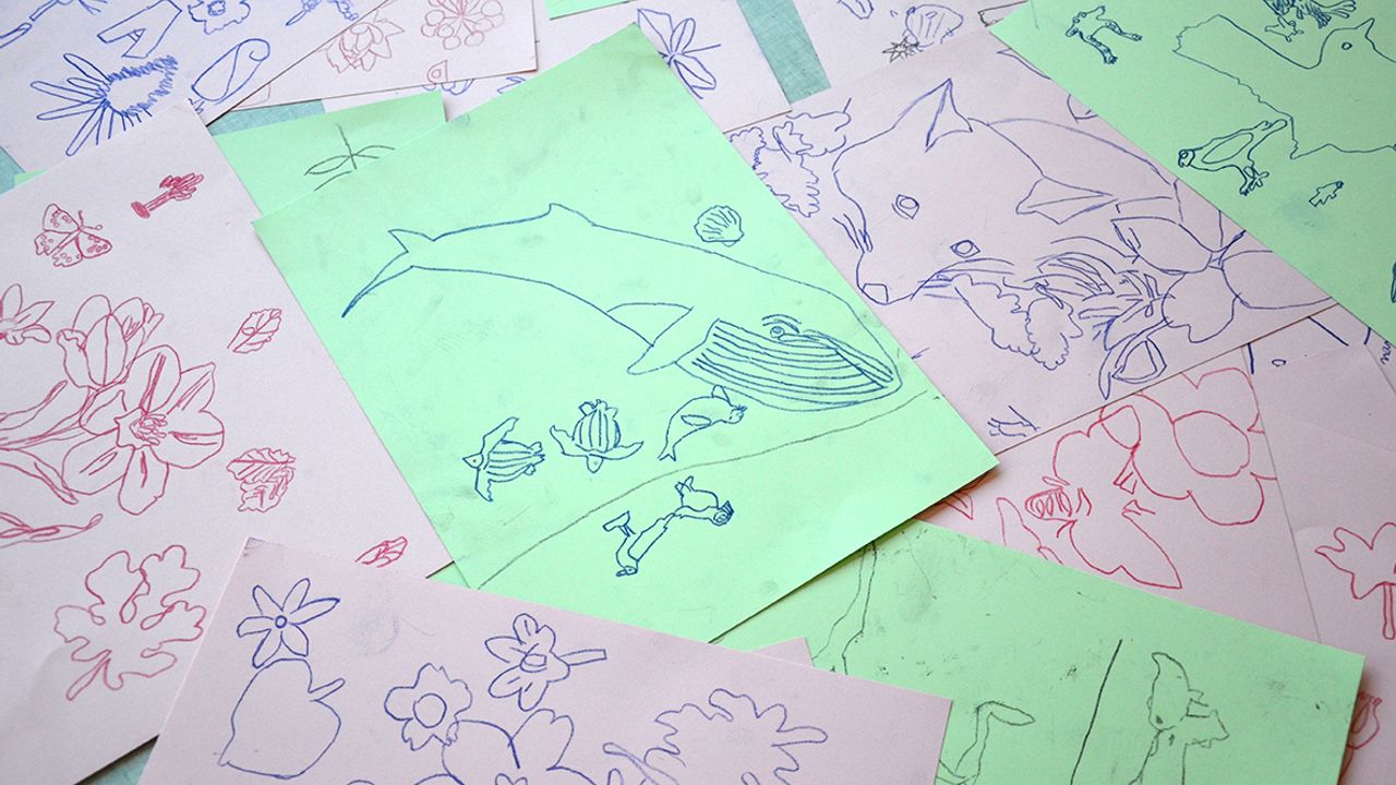 Les feuilles de calque s'emplissent peu à peu de fleurs en tout genre, d'arbres et d'arbustes, de flamands roses, de loups, de baleines, de papillons, de grenouilles et de grandes feuilles aux formes variées. Quand certain·e·s vont accumuler les éléments de façon aléatoire en pivotant leur feuille à chaque nouveau dessin, d'autres cherchent à donner du sens à leur composition et ordonnent les éléments entre eux. À l'aide de différents albums, un élève recompose même des écosystèmes - les fonds marins, la Terre et le ciel - en y plaçant à chaque fois les animaux correspondant à chaque biotope.
