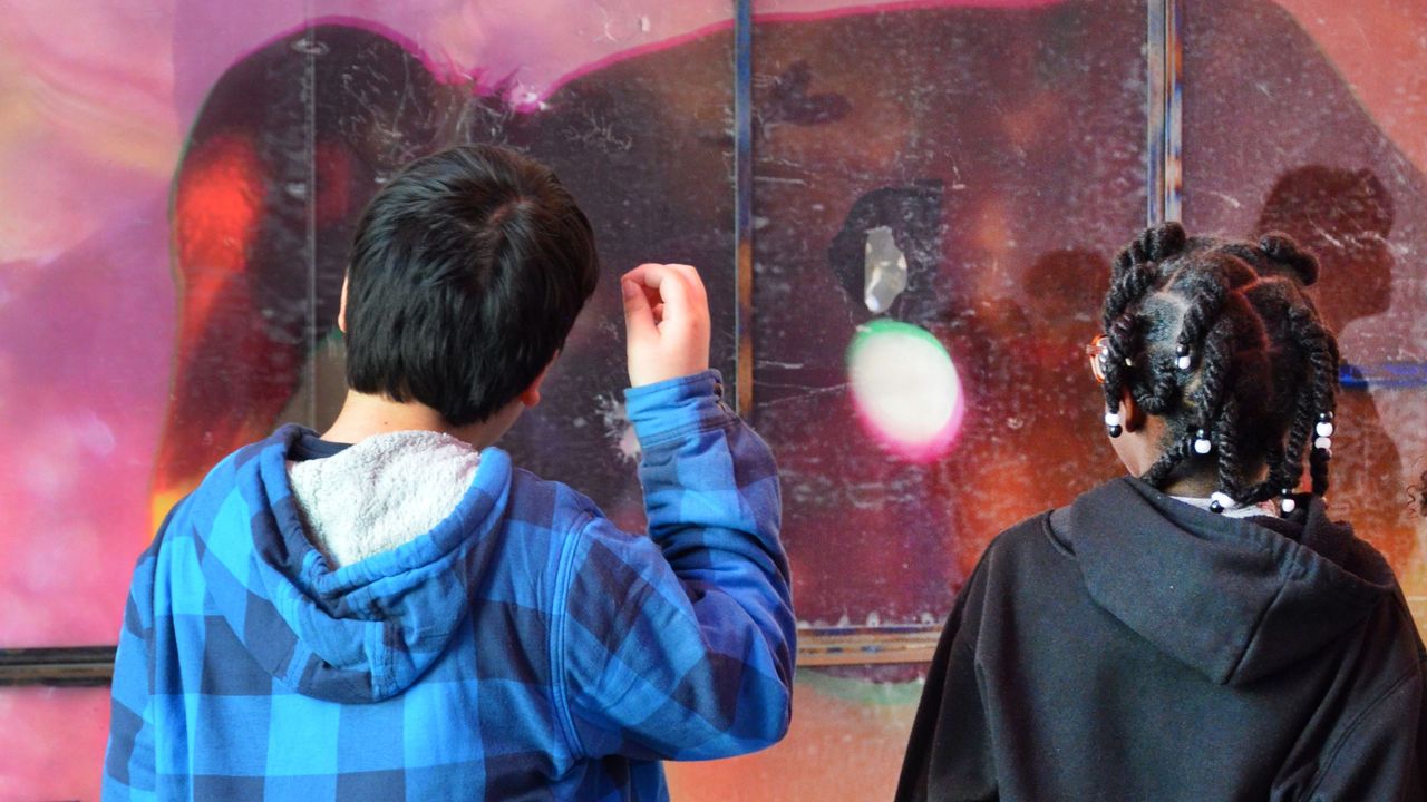 Dès l'entrée, l'observation de l'affiche de l'exposition Daylighting : mais c'est l'eau qui parle donne aux jeunes visiteur·euses quelques clés pour plonger dans l'univers de l'artiste Euridice Zaituna Kala. On y aperçoit une paire de chaussures suspendues à des branches d'arbres dans les tons violets. Cette photo est en négatif et le terme anglais "daylighting" signifie "mettre à la lumière du jour". Quelles histoires l'eau a-t-elle à nous raconter ?
