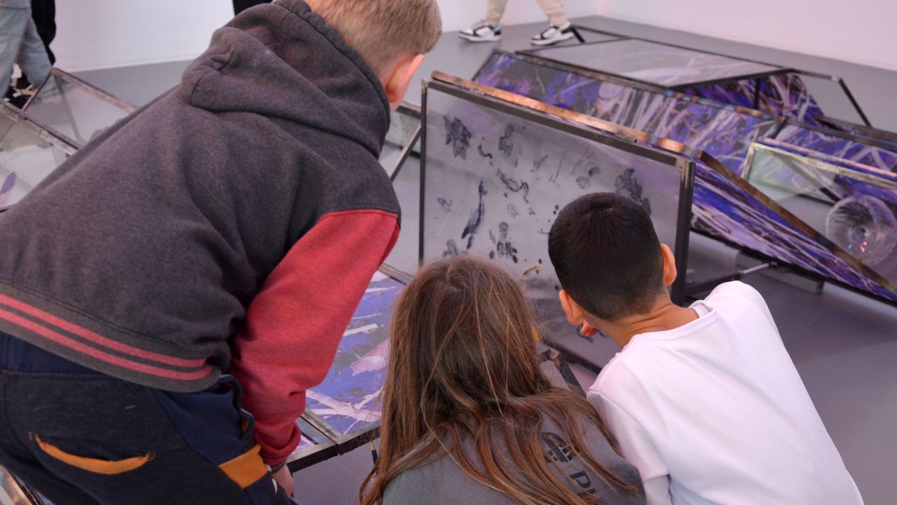 Puis des Oh ! Ah ! C'est beau ! fusent à la découverte de l'atmosphère rose du centre d'art. Les élèves sont invité.es à porter attention où iels mettent les pieds, une grande installation centrale en verre étant posée au sol, Eutrophée : la vague. Après un premier tour de l'exposition, pour soi, chacun.e donne un mot pour décrire ce qu'iel a observé. Mis en commun, ces mots forment déjà un paysage : verre, vague, bleu, métal, voix, peinture, graine, lumière, rose, ciel, terre, etc.