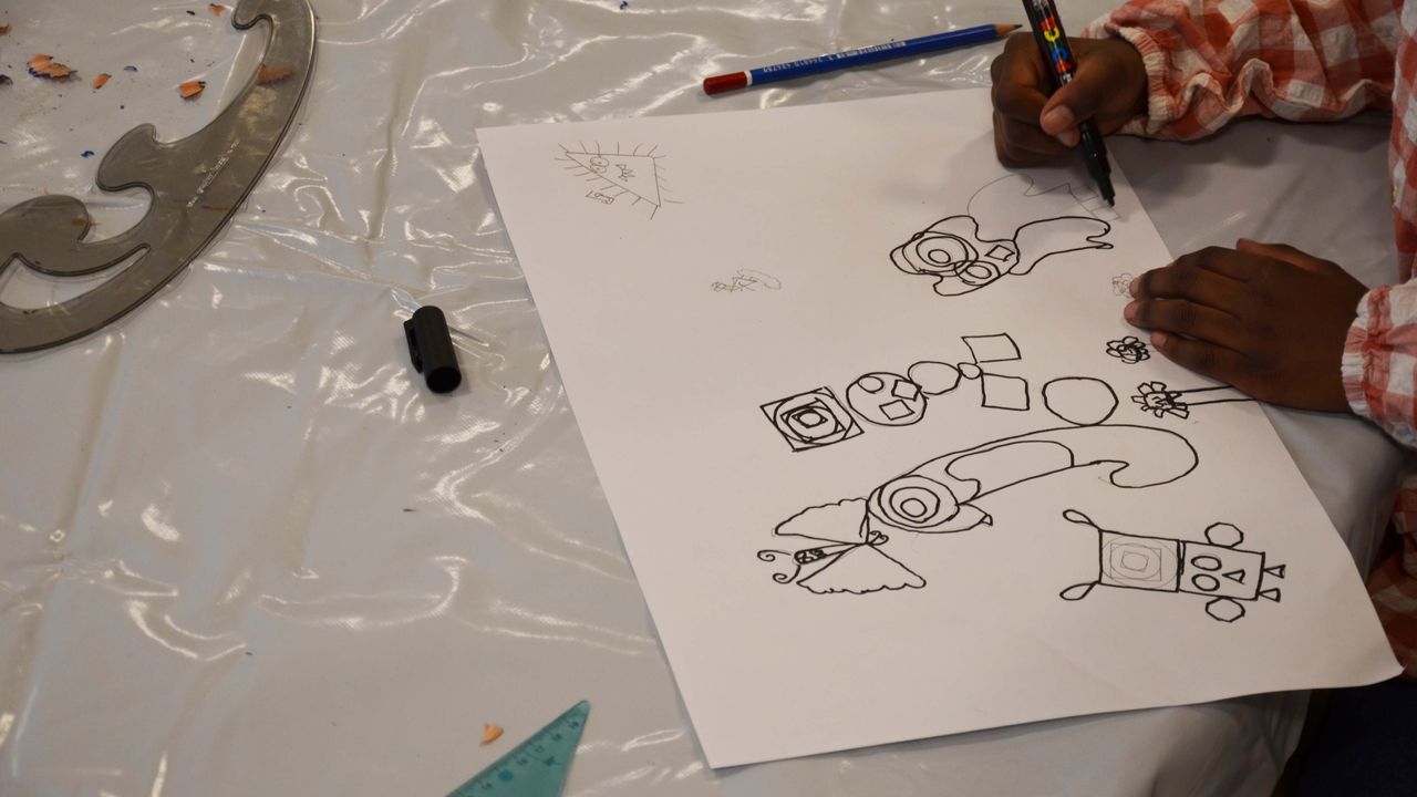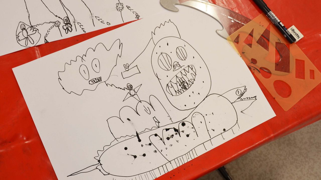 Certain·es remplissent leur feuille et peuplent leur dessin de personnages qu'iels s'appliquent à détailler pendant toute la séance. D'autres dessinent une foule de créatures qui interagissent d'une feuille à l'autre. Des montagnes, des maisons, des motos prennent vie.
