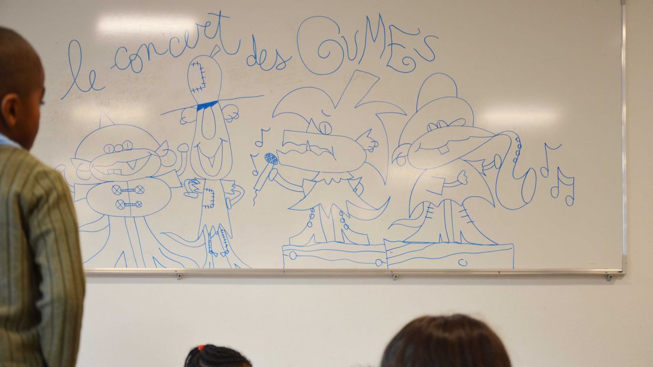 Une fois les dessins finis, un enfant suggère à Jérémy de donner un instrument à l'un des personnages. Une autre élève lève la main et demande à ce qu'il efface la main d'Auberjinn pour la remplacer par un micro et la faire chanter.