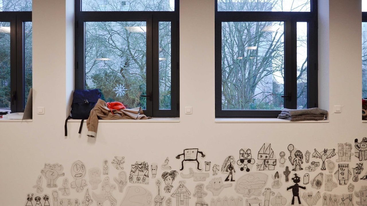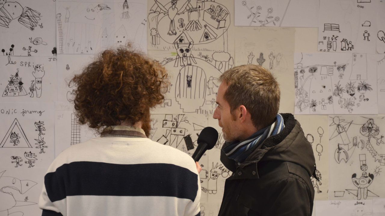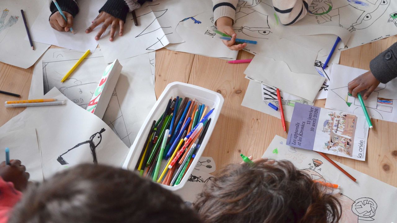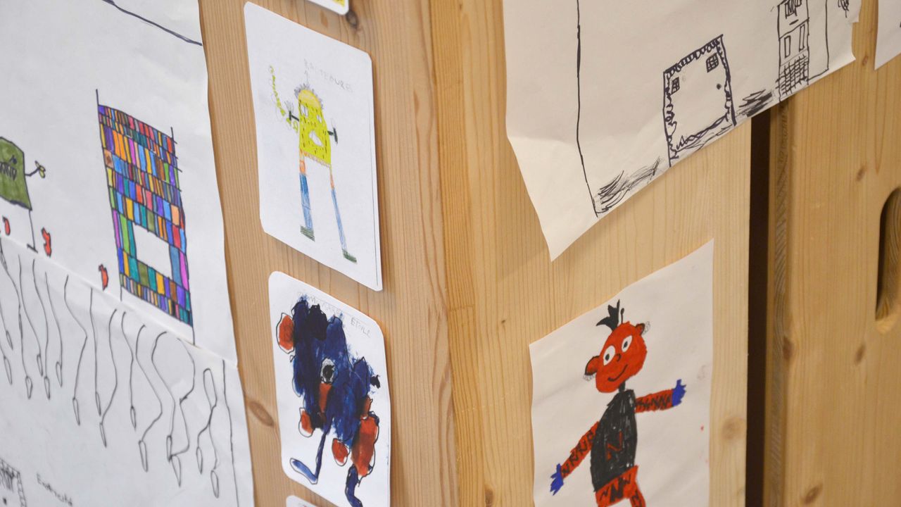 Ils et elles s'amusent à retrouver leurs dessins réalisés durant ces deux premières semaines d'ateliers parmi ceux de leurs camarades.