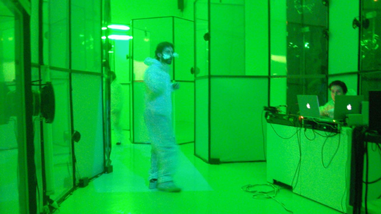Tel qu’il sera décliné à La Criée centre d’art contemporain, Angle mort n’est ni une exposition ni un spectacle. Les trois performers seront présents chaque jour d’ouverture pour mettre à l’épreuve leur propre capacité à la production d’images, de mouvements et de sons. Il ne s’agit pas non plus d’une œuvre processuelle, mais plutôt d’une forme « Live-Concert » ou la prise de risque de la création est maximale. Une forme « Fixe-Théâtre » concerne un rapport frontal à l’œuvre performative. Elle sera donnée la semaine suivante au travers de 3 représentations au théâtre du Vieux Saint-Etienne.