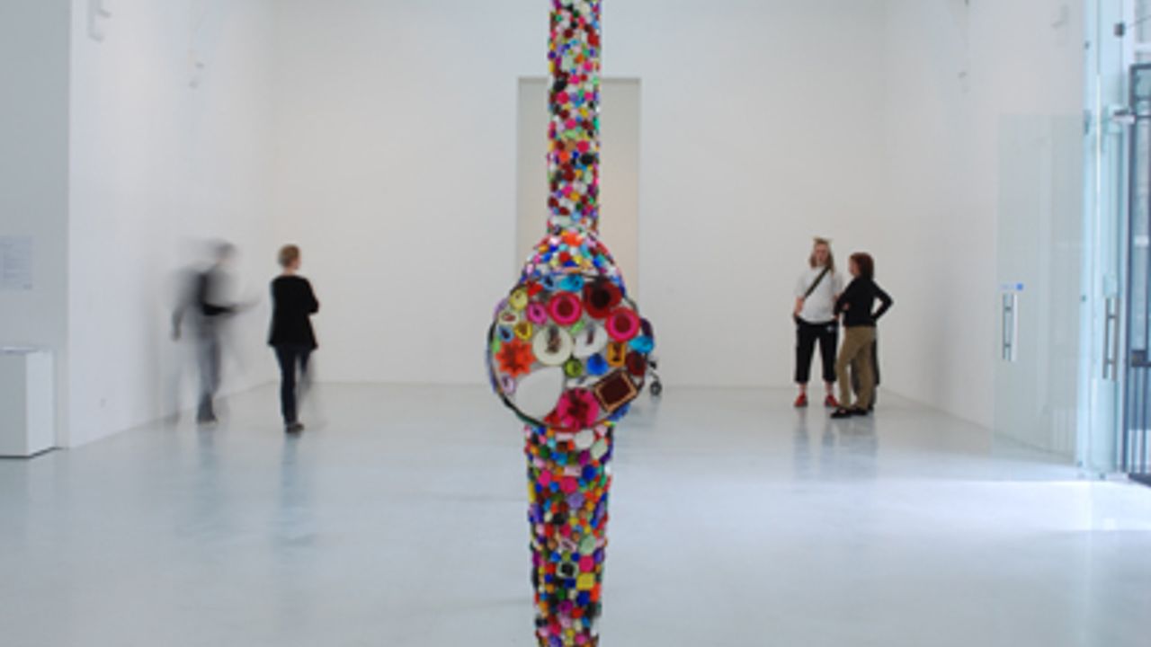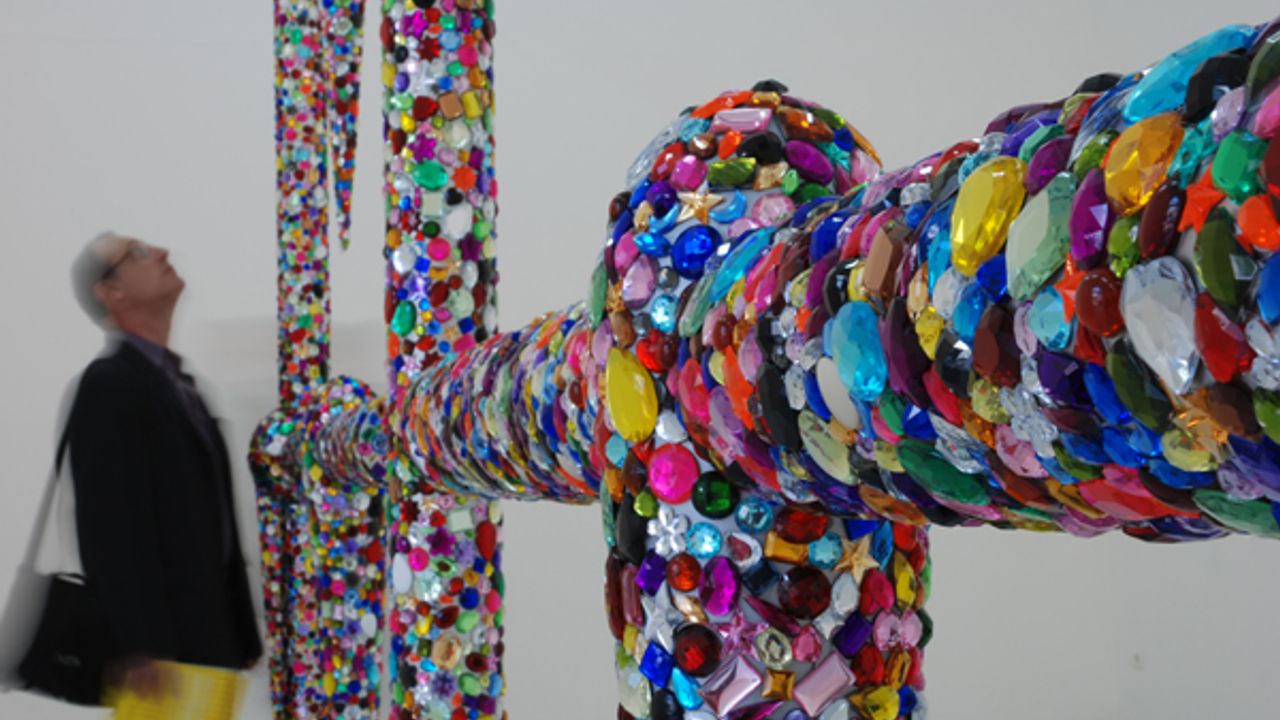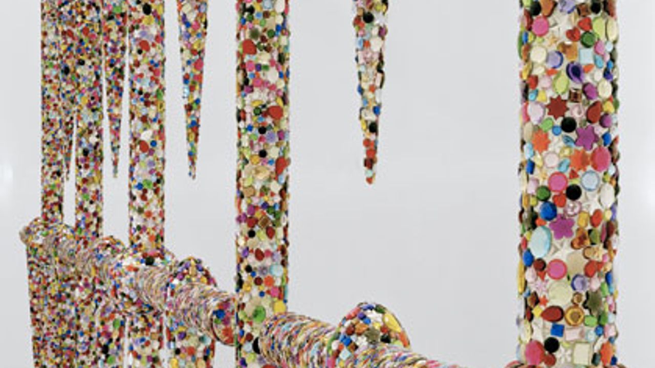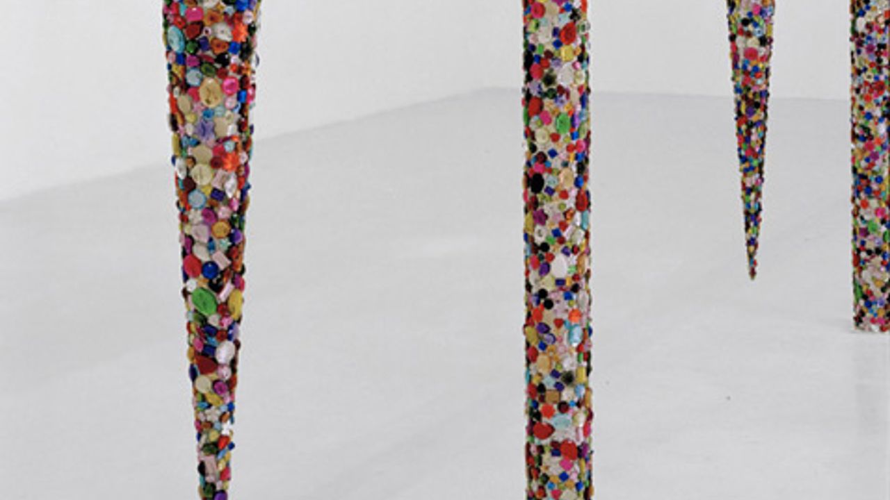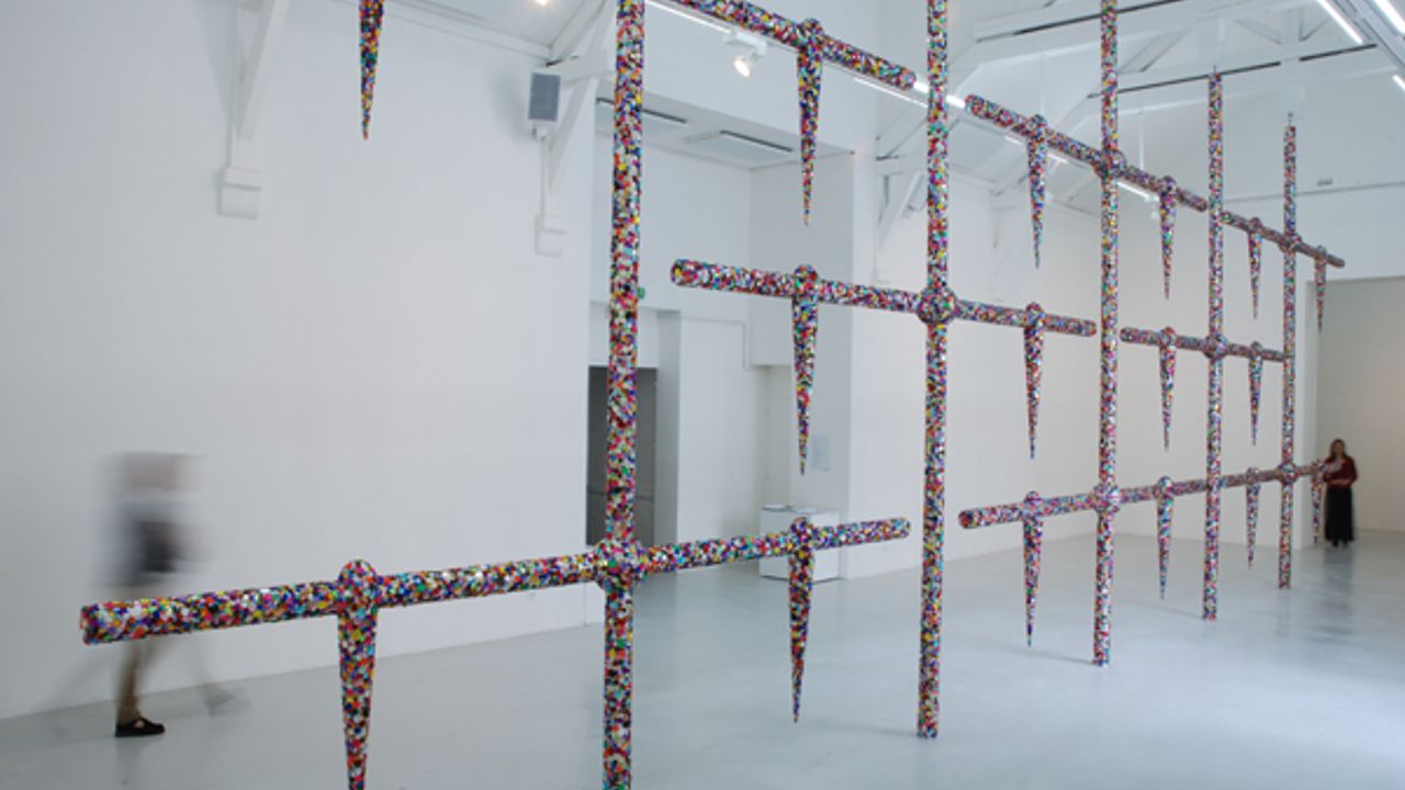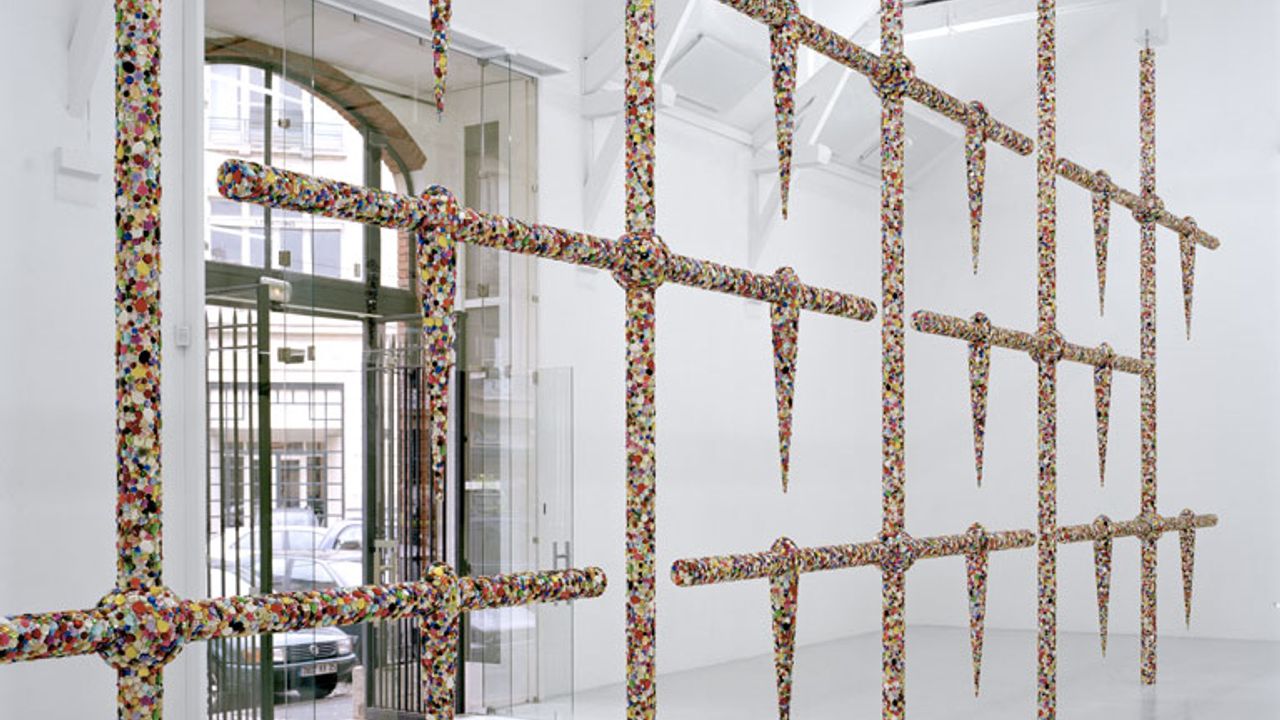 Paola Pivi produit pour La Criée centre d’art contemporain une surprenante installation constituée d’une vaste structure en acier qui se déploie du sol au plafond de la grande salle d’exposition. L’ensemble compose une structure en grille entièrement recouverte de perles multicolores ayant l’aspect de pierres précieuses. Cette structure en grille est ponctuée de modules abstraits en suspension qui peuvent faire référence à des gouttes d’eau ou à des larmes. Pénétrant dans l’espace d’exposition, le visiteur se trouve face à cette œuvre monumentale qui oscille entre surface plane d’un tableau et volume d’une sculpture. Au-delà de ces identifications, l’œuvre convoque des perceptions volontairement contradictoires et paradoxales :