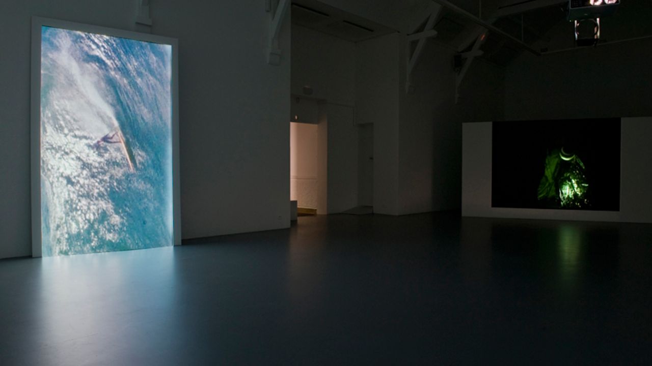 The Endless Summer, extrait du film du même titre réalisé en 1966 sur des surfeurs à la recherche des meilleures vagues en Afrique, est exemplaire de ce rapport des corps à l’espace océanique. Les images de surf sont projetées sur un large panneau rectangulaire en bois qui, depuis le sol, vient sobrement s’adosser aux murs de La Criée. Basculée d’une horizontalité panoramique conventionnelle à une verticalité inhabituelle, l’image creuse encore davantage l’espace de la vague.