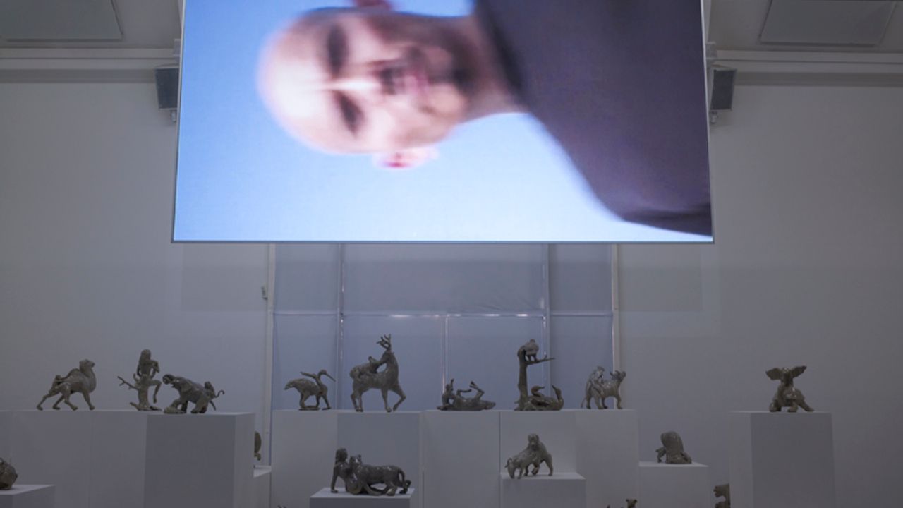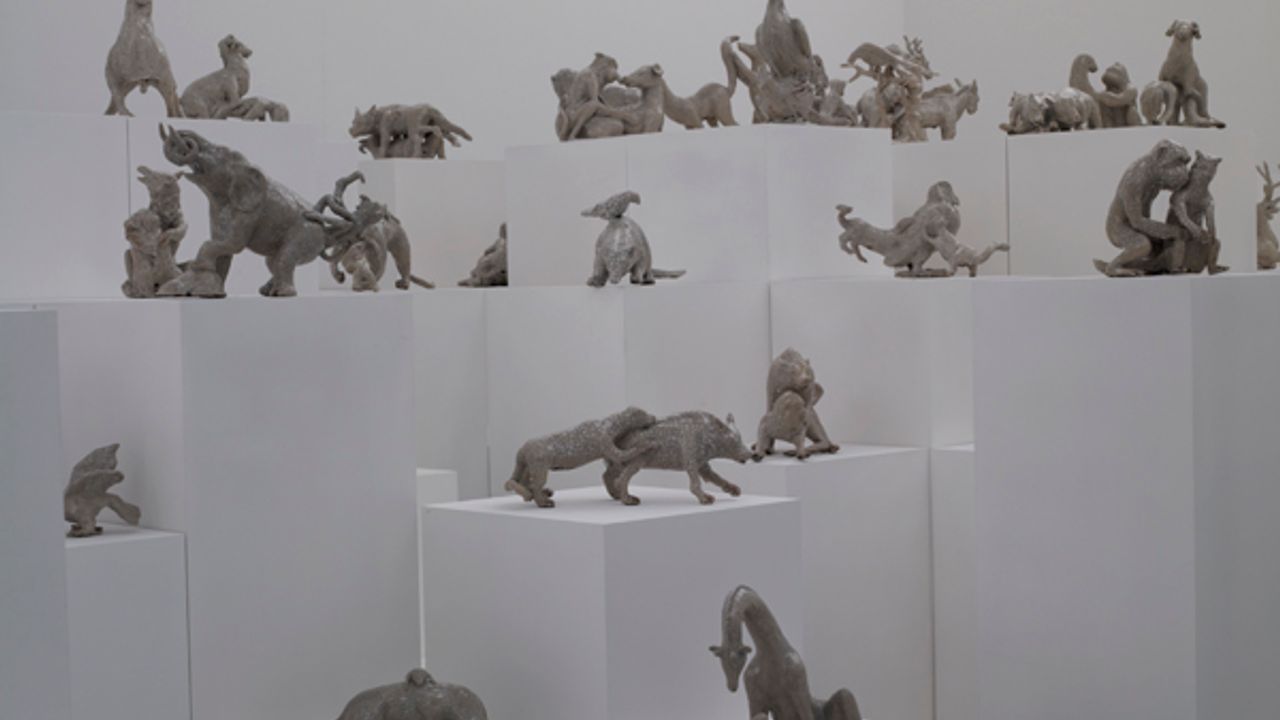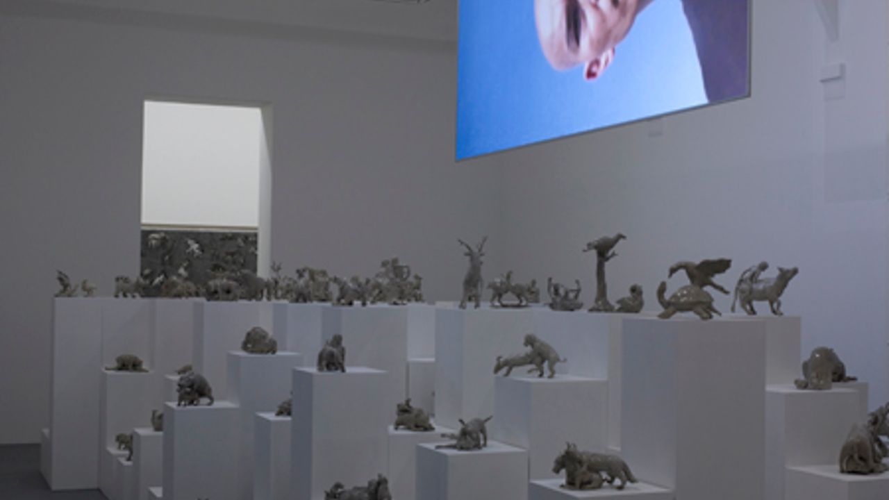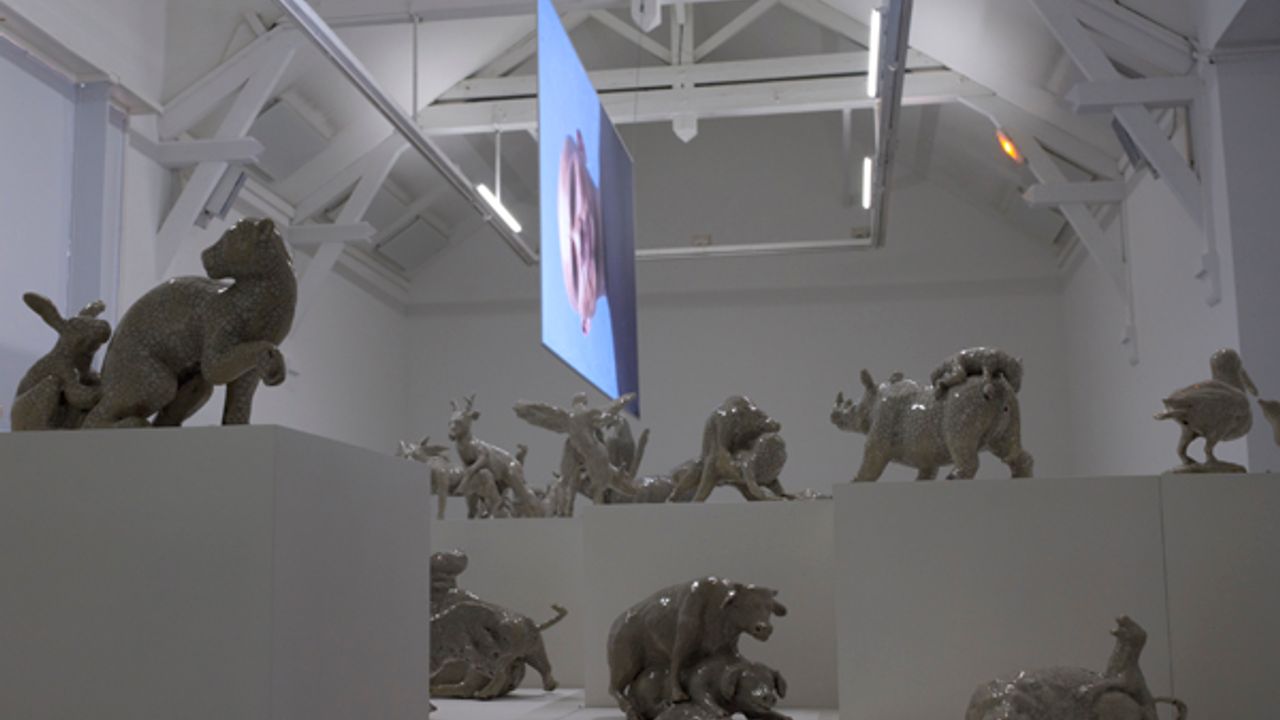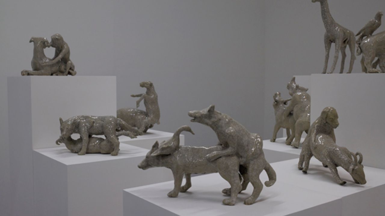 L’installation Stranger than paradise, Mountain Top (2011) présentée dans l’espace d’exposition principal est constituée de 200 sculptures en céramique placées sur des socles de hauteurs différentes et qui représentent des animaux dans une posture d’accouplement. Chaque duo associe des espèces différentes (par exemple un éléphant et un tigre, une cigogne et un puma, un loup et un singe) bravant ainsi les singularités et incongruités physiques. Articulée à ce paysage sculptural, une vidéo intitulée Gong… (2011) montre l’artiste filmé en train de heurter un gong en bronze avec sa tête. Chaque impact provoque un son se dispersant dans l’espace d’exposition. Chaque impact provoque également le tremblement de l’image. Le visiteur, poursuivi par ces vibrations visuelles et sonores, devient la cible des coups. Enfin, dans une des salles du centre d’art, les scènes animalières précédemment évoquées – métaphores des différences, mutations, confusions, identités symptomatiques du monde d’aujourd’hui – investissent cette fois-ci la surface de panneaux de peinture à l’encre sur soie qui composent l’œuvre Stranger than Paradise 1 (2011).