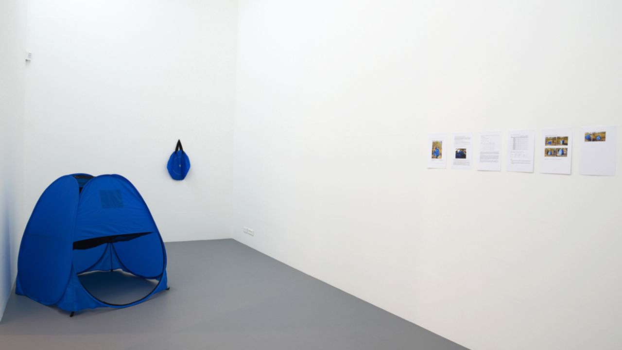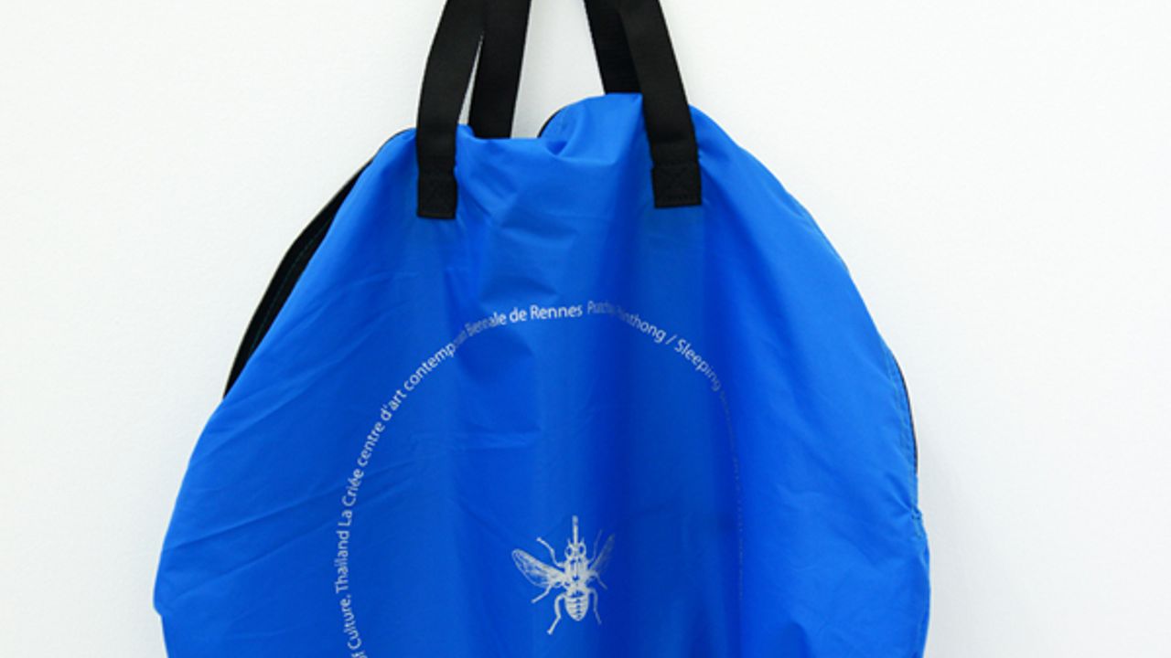 À Rennes, Pratchaya Phinthong présente sleeping sickness. L’exposition dévoile un prototype de piège écologique, conçu en dialogue avec des chercheurs et scientifiques. Face à ce piège, dont l’aspect est proche de celui d’une petite tente en tissu de couleur bleue, un moniteur diffuse la bande son d’une campagne de santé sur la maladie du sommeil. L’artiste a choisi de retranscrire le script du film en sous-titres sur fonds noir. Les images ayant été ôtées du documentaire, seul un dessin réalisé par l’illustrateur thaïlandais Vichai Malikul permet d’accéder à une représentation du fléau et plus précisément de l’insecte transmetteur de la maladie. Par ailleurs, au moment où le public prend connaissance de cette production inédite, 500 tentes bleues – dont la réalisation a été confiée à une entreprise thaïlandaise – sont déployées en Zambie, Ethiopie et Tanzanie afin de tester en situation l’efficacité de ces nouveaux pièges. Les populations locales seront invitées à transmettre, tout au long de la Biennale, des images des pièges en contexte, qui seront exposées dans l’espace de La Criée.