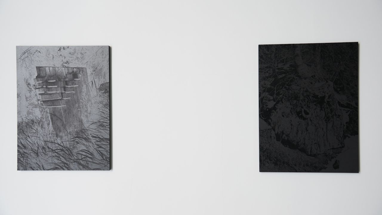 Deux séries photographiques, Souches et Trou dans le Miroir nous guident sur des chemins tantôt sombres et interrogatifs, tantôt drôles et lumineux, où se tissent les amorces d’un récit ouvert. En regard de ces tirages, des sculptures aux formes étranges et pourtant familières, en bois, plâtre, papier, poussière habitent l’espace du sol au plafond. L’installation vidéo Galaxy Evolution Melody, dans la petite salle, nous permet quand à elle de découvrir pas à pas les systèmes et les imaginaires à l’œuvre dans la pratique du duo d’artistes.