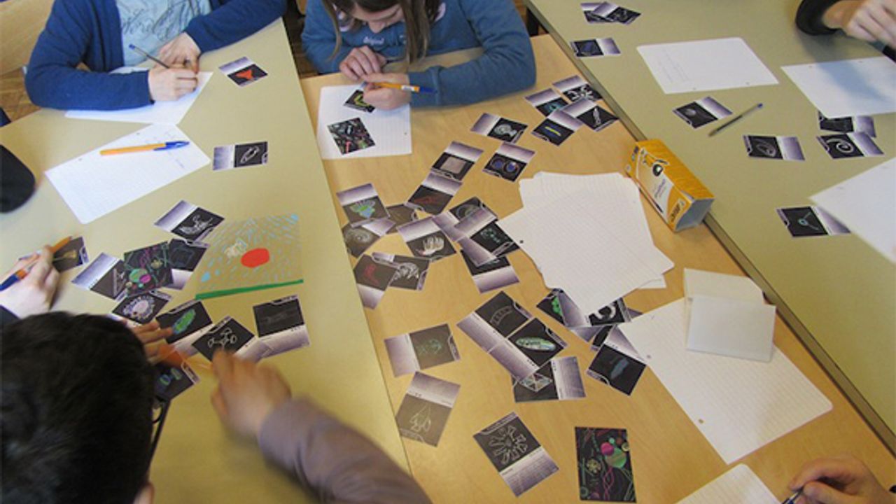 La première étape est de réaliser des « nuées » de planctons dessinées avec les élèves dans les établissements scolaires de Rennes et Saint-Malo. « Si l’on imagine le collage de centaines de planctons sur une grande surface, « la nuée » sera lisible de loin comme une forme étrange constituée de taches géantes, et de près, on distinguera des formes complexes, le foisonnement de tout petits éléments marins. »