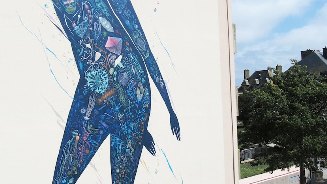Pendant 9 jours, Mioshe à réalisé un Humano Plancton haut de 16m. Cette peinture murale, dernière étape de la résidence de l’artiste, est inspirée des dessins de tout les élèves participants au projet. Vous pourrez la trouver à Saint-Malo, rue des halles.