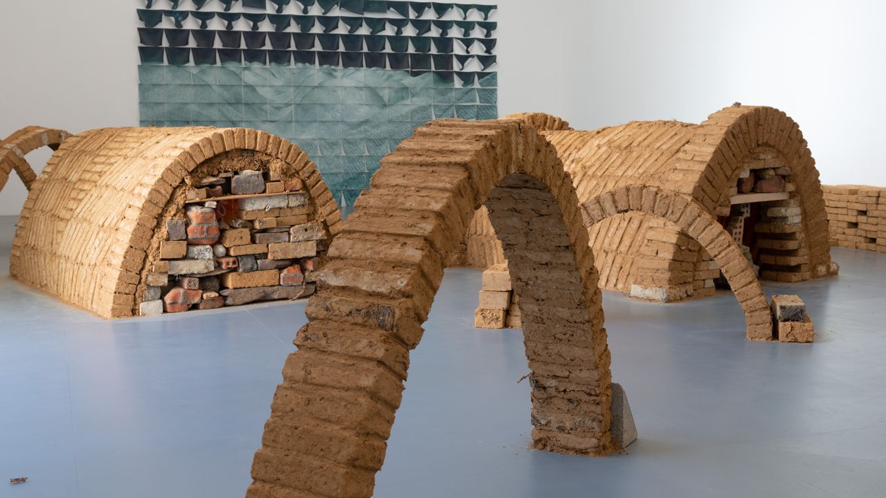 Droits réservés : Elvia Teotski, Molusma, 2021, installation in-situ en briques en terre crue réalisées à partir de terres de chantier, algues d'échouage, sable, vase, détritus de plage, déchets déshydratés d’algues alimentaires et assemblées à d’autres rebuts, constituant un ensemble destiné à l’accueil de criquets, dimensions variables, vue de l'exposition Molusma, du 25 septembre au 19 décembre 2021, production : La Criée centre d'art contemporain © Benoît Mauras