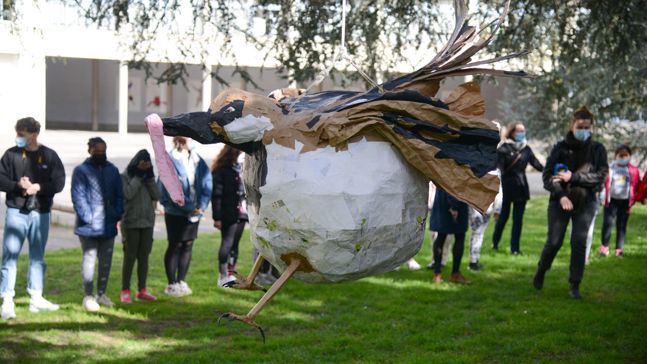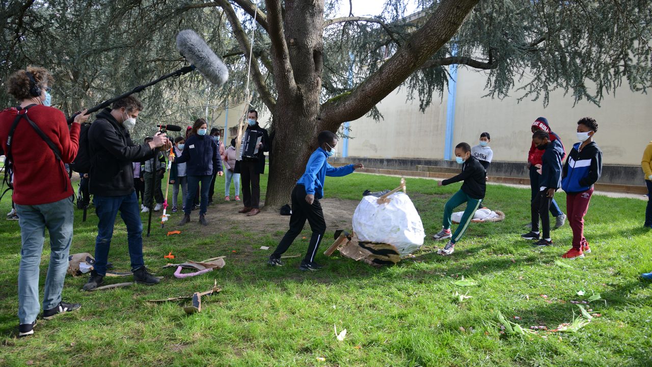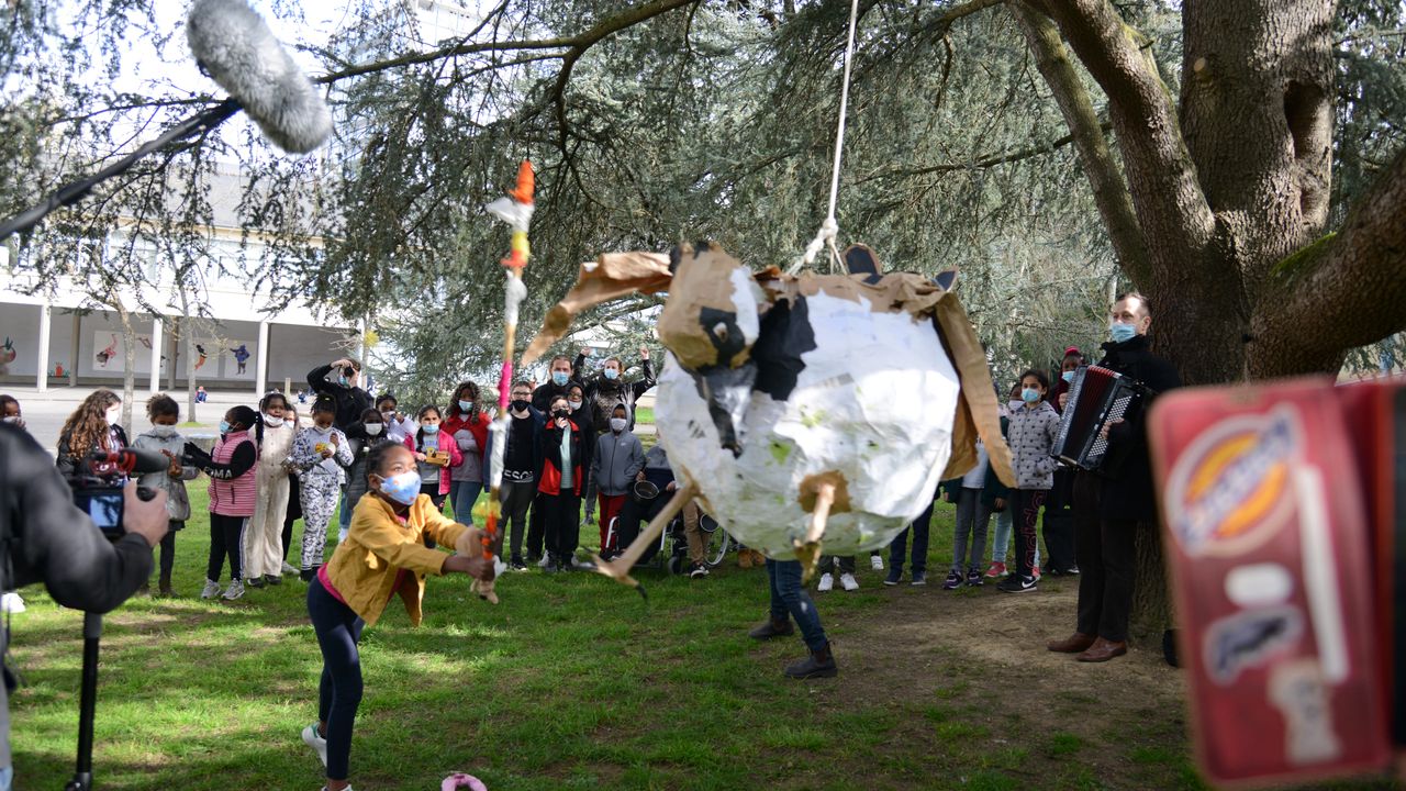 Droits réservés : Éléonore Saintagnan, Moineaux, tournage autour de la piñata avec les élèves de CM1-CM2 de l’école Trégain, Rennes, mars 2021 -- photo : Benoît Mauras