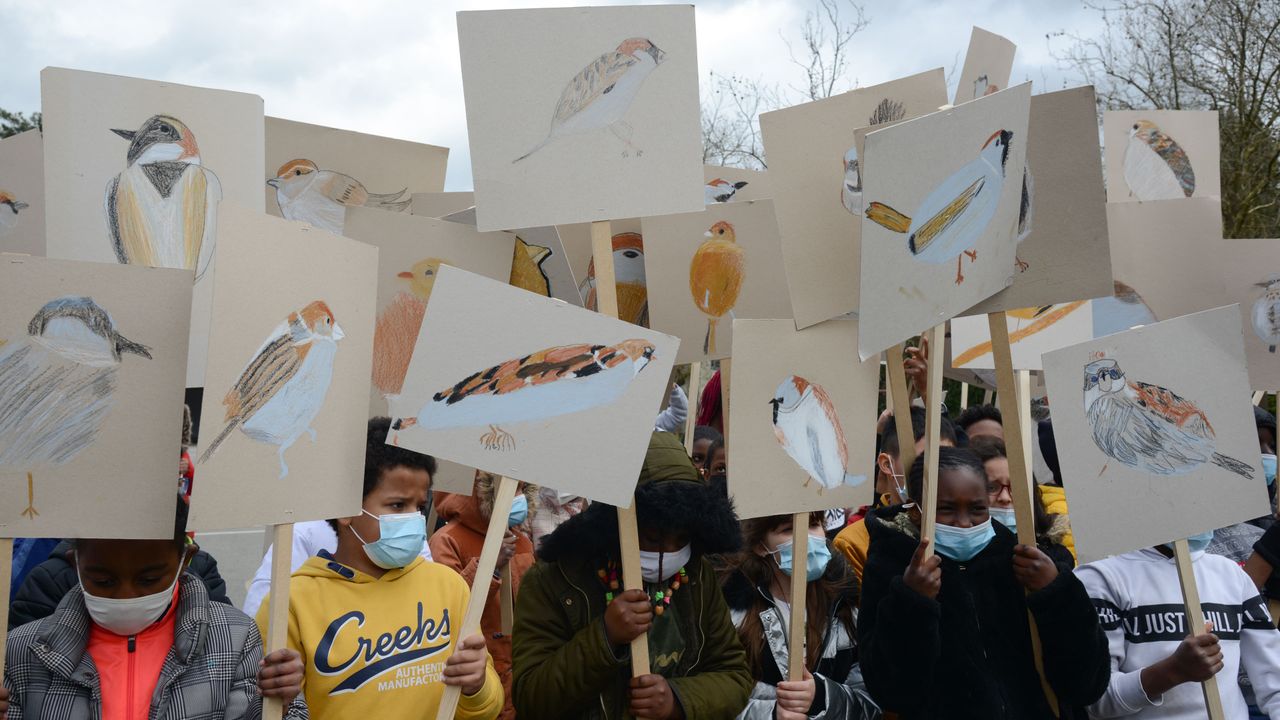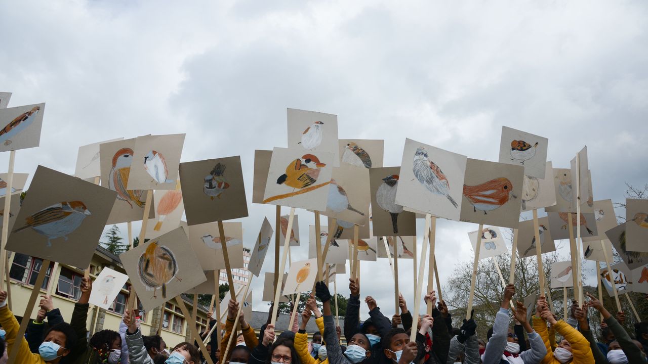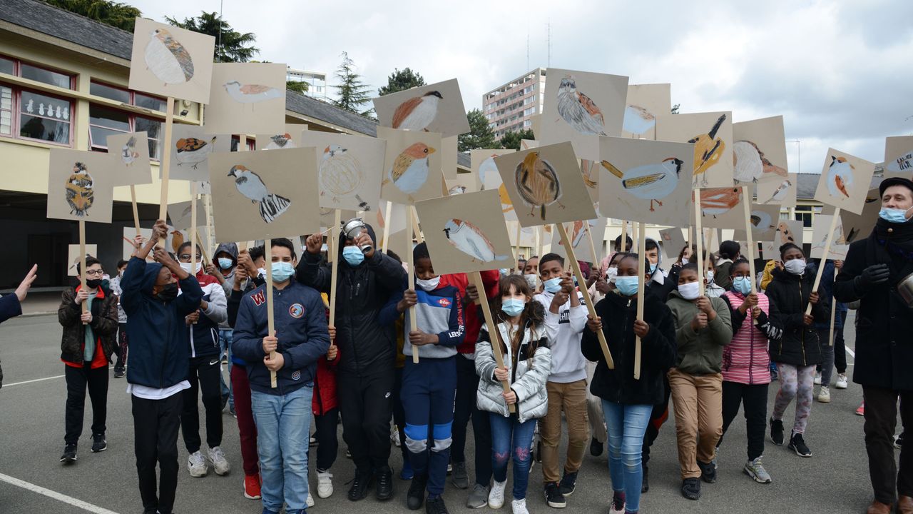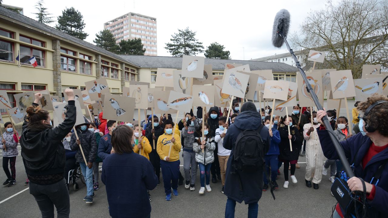 Droits réservés : Éléonore Saintagnan, Moineaux, tournage de la manifestation avec les élèves de CM1-CM2 de l’école Trégain, Rennes, mars 2021 -- photo : Benoît Mauras