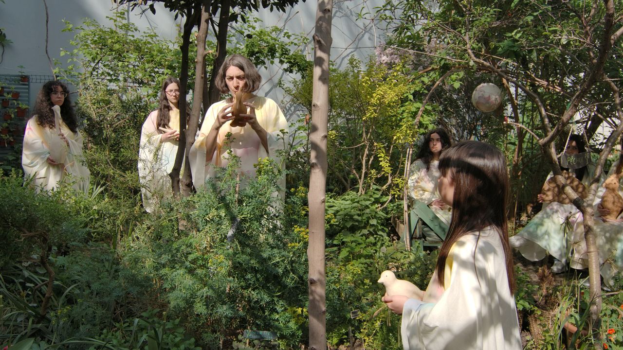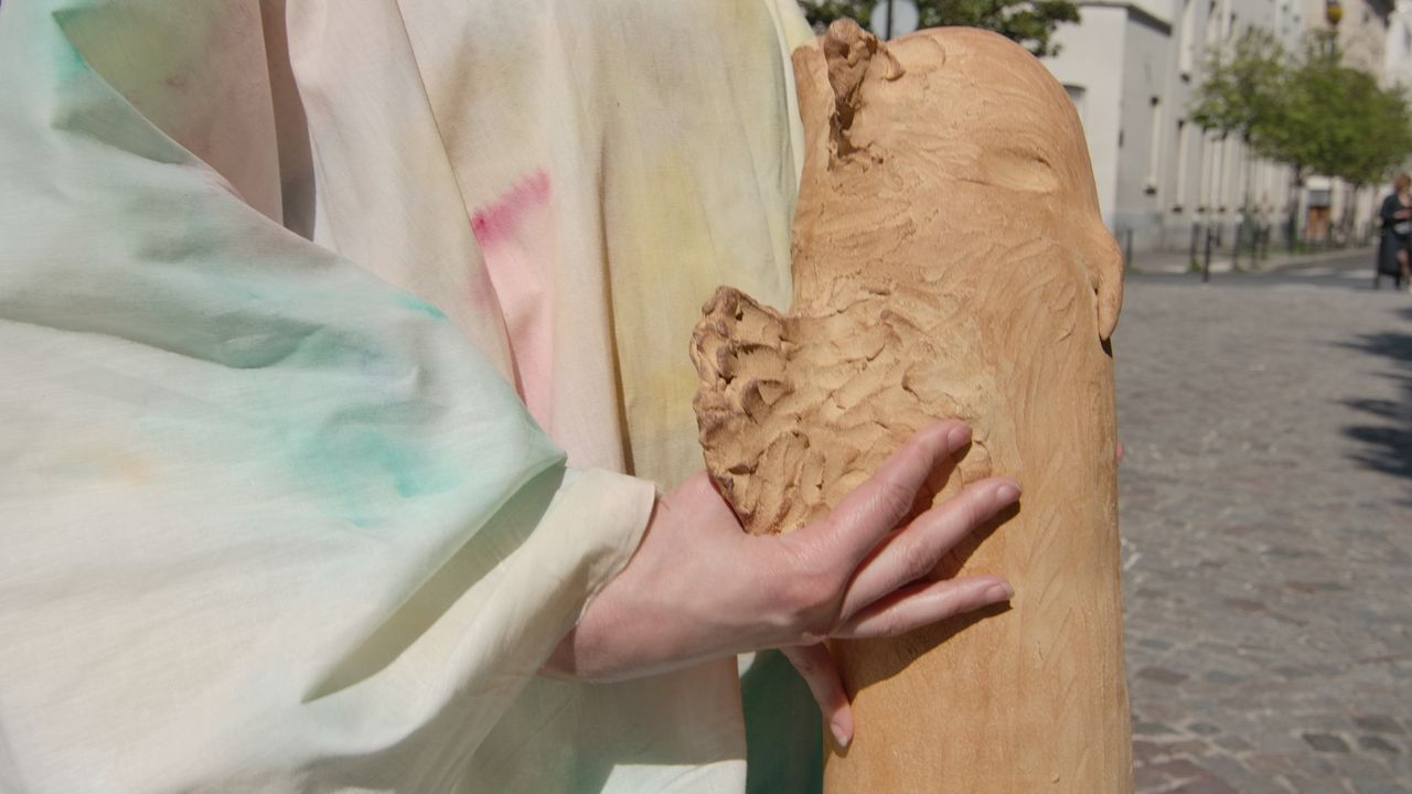 Ces sculptures sont aussi des instruments de musique. On entend leur chant dans le film qui les accompagne et dans lequel une procession de musiciennes les activent, ainsi qu’à l’occasion de performances, qui viennent faire résonner l’espace d’exposition.